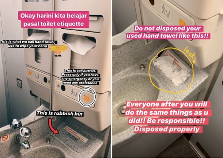 이후 그는 쓰레기통 사용이 잘못된 예시에 대해 올려두었습니다. 사진 속에는 휴지가 쓰레기통 안으로 완전히 들어가 있지 않아 쓰레기통 뚜껑이 열려있는데요. 그는 승객들에게 쓰레기를 ‘잘’ 버려달라고 부탁하고 있습니다. 만약 쓰레기통 뚜껑이 닫히지 않은 채 쓰레기를 버리면 뒷사람도 똑같이 행동하게 된다고 합니다. 이후 쓰레기통 뚜껑을 만지지 않고도 쓰레기를 버릴 수 있는 방법도 소개했습니다. 바로 핸드타월을 뽑아 이걸로 뚜껑을 끝까지 민 후 쓰레기를 버리라는 것이었습니다.
