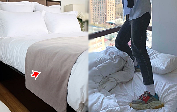 방 안에 가장 들어가면 제일 먼저 하는 것은 바로 침대 위에 있는 장식용 쿠션과 베드 러너를 내려놓는 것입니다. 호텔에서는 베드러너와 쿠션을 잘 빨지 않는다고 하네요. 참고로 베드 러너는 침대 발쪽에 가로로 늘어뜨려져 있는 천인데요. 이는 집안에서 신발을 신고 생활하는 문화가 있는 사람들이 신발을 신고 침대에 올라갔을 때 침구가 더러워지는 것을 방지하기 위한 인테리어 소품입니다.
