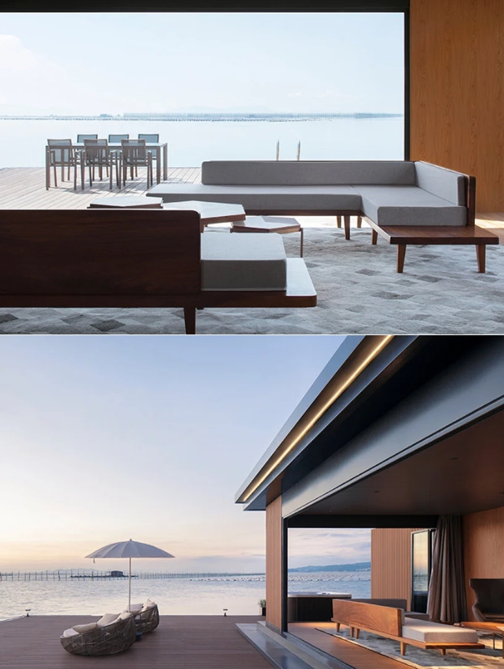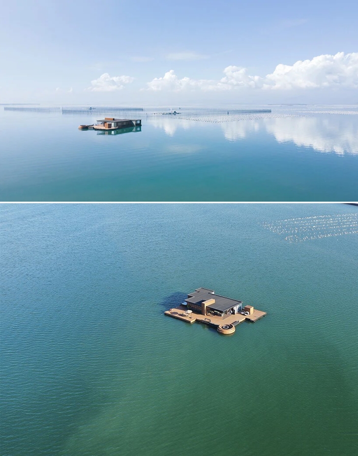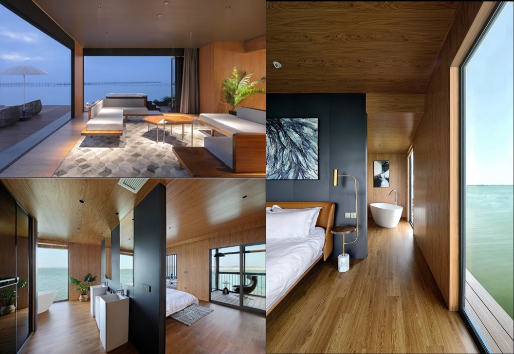이 호텔은 둥산현 해안에서 500미터 떨어진 곳에 위치하고 있으며 이름 그대로 바다 위에 둥둥 떠 있는 호텔입니다. 밸런스 디자인(Balance Design)에서 설계한 이 호텔은 바다 위에 떠 있기 때문에 무엇보다 안전에 중점을 두고 설계를 했습니다. 해류, 몬순과 같은 요소를 고려했으며, 허리케인을 견딜 수 있도록 설계했죠. 또한 이 호텔이 안전하게 잘 떠있을 수 있도록 낚시 뗏목을 연구해 이 호텔을 설계했습니다. 소재 또한 남다릅니다. 지붕은 공항 터미널과 요트에서 사용되는 재료로 만들었으며 실외 데크는 환경 친화적이면서도 화제에 강한 재료를 사용했다고 하네요.