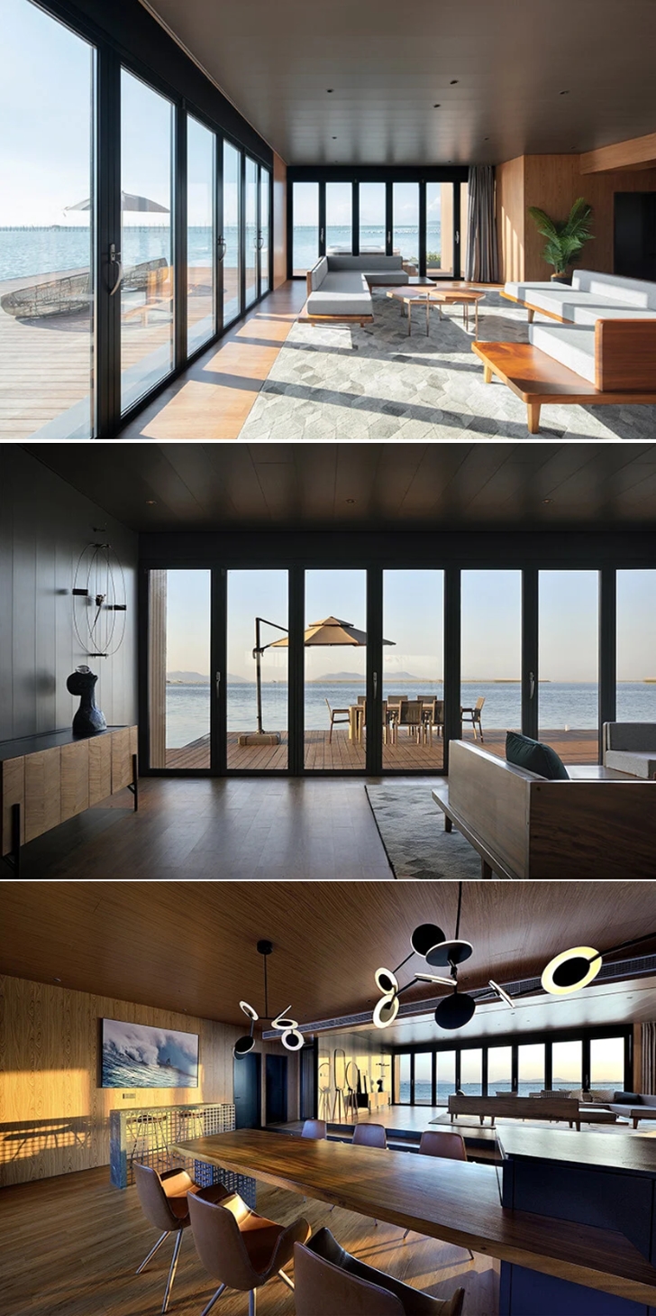 안전에 이어 신경쓴 부분은 인테리어입니다. 이곳은 약 150평 정도의 크기로 거실, 주방, 3개의 침실로 구성되어 있는데요. 내부는 가능한 한 단순하게 설계되었고, 전체적으로 우드톤을 사용했으며 집안 곳곳에서 파노라마 오션뷰를 즐길 수 있도록 설계되었습니다. 거실의 벽은 폴딩도어로 구성했는데요. 폴딩도어를 완전히 접으면 바다의 풍경이 액자처럼 들어와 평화롭고도 낭만적인 오션뷰를 즐길 수 있습니다.