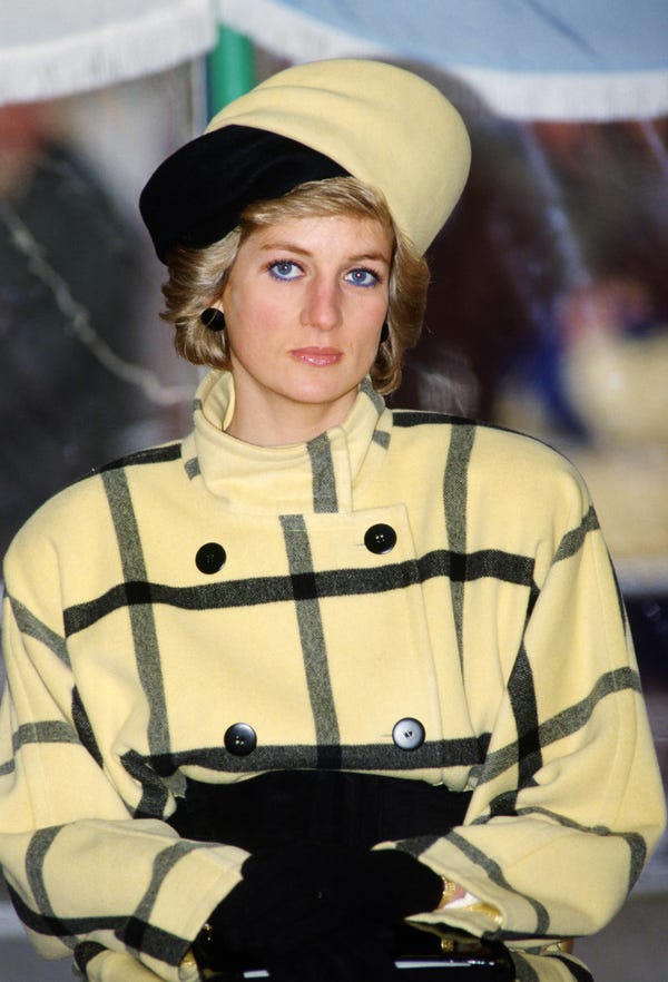 1998년 노란색 플레이드 체크무늬의 코트와 같은 컬러의 모자를 착용한 다이애나비의 모습입니다.
