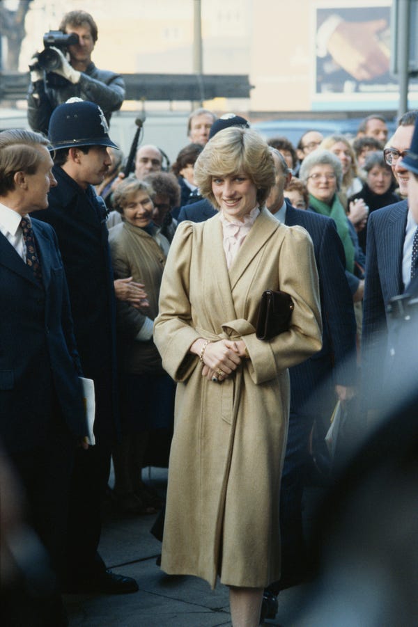 1982년 12월 캐롤라인 찰스의 코트를 착용한 다이애나비의 모습입니다. 클래식한 디자인으로 차분한 패션을 선보였습니다.