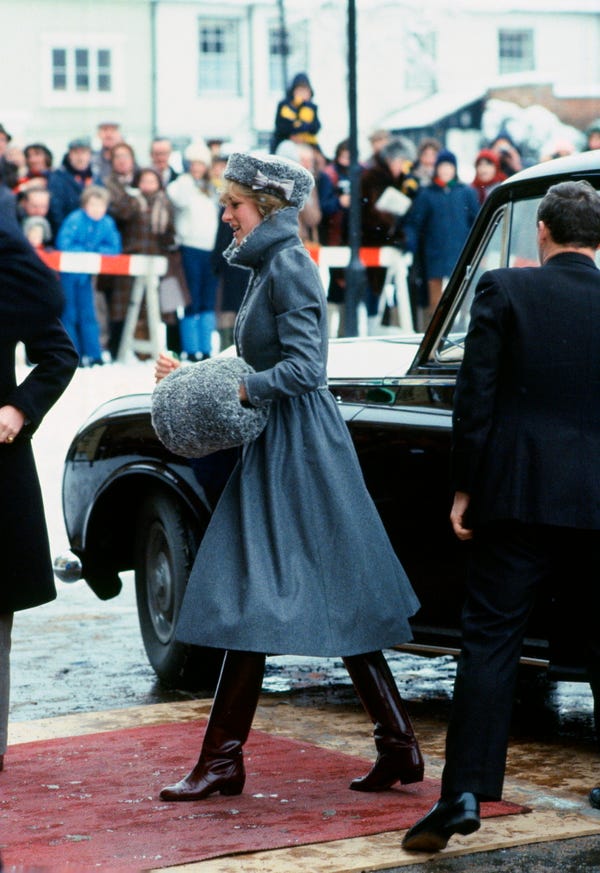 크리스마스 예배를 보기 위해 글로스터셔 예배당에 도착한 다이애나비의 패션입니다. 마호가니 컬러의 가죽 부츠를 신고 퍼로 만들어진 모자와 핸드 머프가 눈에 띕니다.