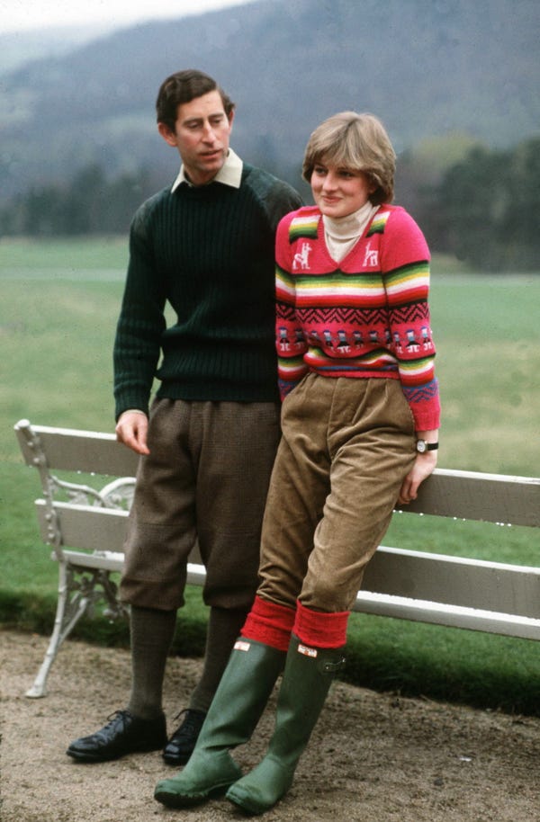 컬러풀하고도 캐주얼한 겨울 패션을 보여준 19세의 다이애나입니다. 화이트 컬러의 터틀넥, 따뜻하면서도 화려한 스웨터, 카키 컬러의 코듀로이 팬츠, 그리고 그린 컬러의 레인부츠를 함께 매치했습니다. 이 패션은 다이애나비가 약혼 후 결혼하기 전 공개한 것입니다.
