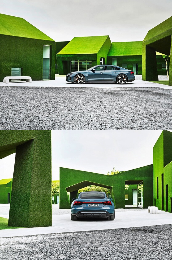 전면부에는 기존의 아우디 벌집 그릴을 재해석한 형태의 그릴을 장착했네요. 물론 전기차이기에 이 부분은 일부 막혀있습니다. 루프 라인은 뒤쪽을 향해 완만하게 경사져 있으며 휠 아치는 역동적인 이미지를 강조하기 위해 강렬한 라인을 지니고 있습니다. 뒷모습 또한 스포티하면서도 에어로 다이나믹한 디자인으로 구성되어 있습니다.