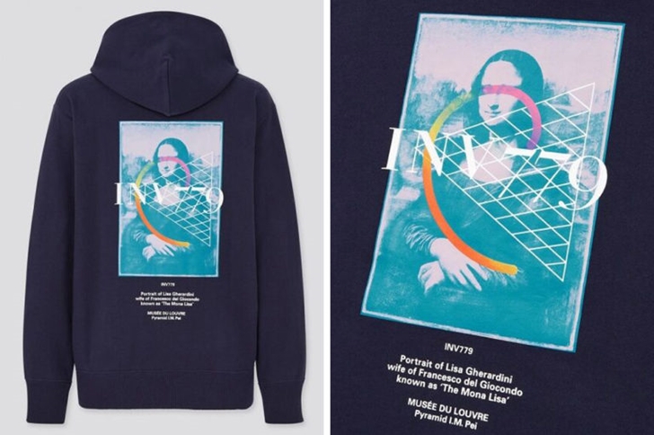 그림뿐만이 아닙니다. 조각상도 컬렉션의 일부로 사용되었습니다. 회색 맨투맨에는 '밀로의 비너스'가 실루엣으로 프린터 되었는데요. 'Venus de Milo'라는 핑크색 태그가 비너스의 가슴을 가로지르고 있어 모던함을 더하고 있습니다. 후드 티셔츠도 있습니다. 이 후드 티셔츠의 그래픽을 위해 피터 사빌이 나섰는데요. 그는 모던함과 고전 예술을 섞어 독창적인 프린트를 만들어 냈습니다. 피터 사빌은 모나리자를 자신만의 방식으로 재해석하고 위에는 779라는 단어를 프린트했는데요. 779는 모나리자의 소장품 번호라고 합니다.