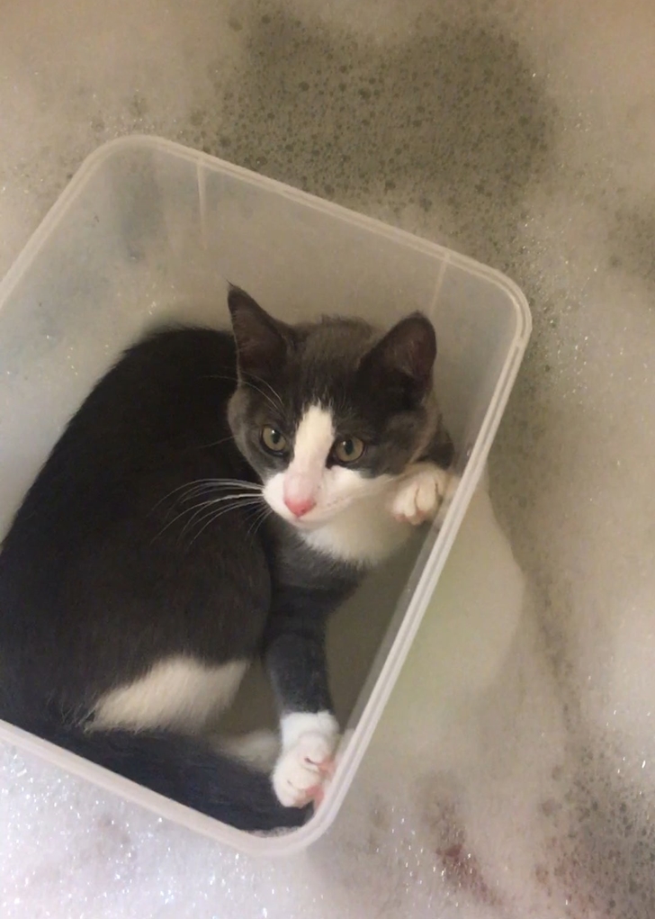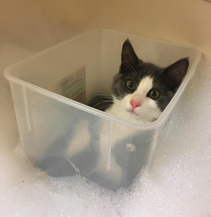 고양이를 키우는 한 반려인은 자신이 목욕을 하러 들어갈 때마다 고양이가 너무 울어 고민이었습니다. 이에 이 반려인은 플라스틱 통에 고양이를 넣어 함께 목욕을 하러 들어가기 시작했죠. 박스 안에서 고양이는 너무나 얌전했습니다.
