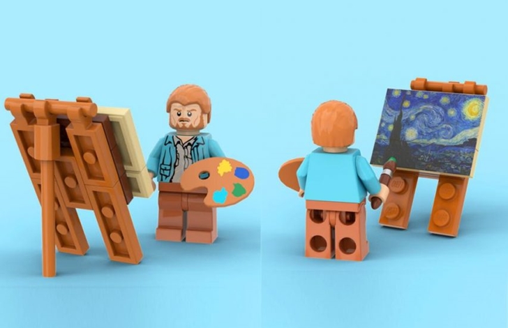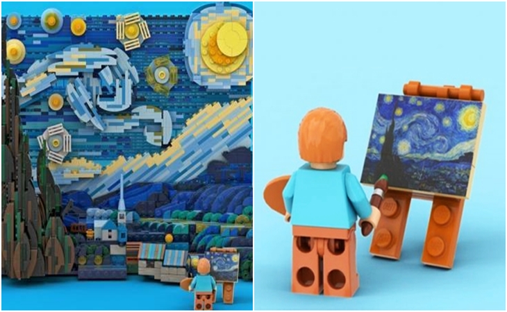레고의 클립과 브라켓은 소용돌이 치는 구름을 형성하고, 플레이트는 산허리와 덤불을 형성하며 레고의 곡선 부분은 나무가 되기 위해 쌓입니다. 또한 이 세트에는 빈센트 반 고흐 미니 피규어와 붓, 그림 팔레트, 이젤, 그리고 타일에 인쇄된 별이 빛나는 밤 작품이 함께 포함되어 있습니다.