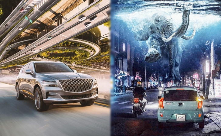 특히 제네시스에서는 미국에 제네시스 최초의 SUV인 GV80을 선보이며 'GV80 아티스트 시리즈'를 선보였는데요. 이 시리즈는 8명의 아티스트가 참여해 총 23개의 작품을 선보이는 프로젝트였습니다. 람사워는 이 중 3개의 작품을 맡았는데요. 'Beyond Reflection' 'Parallels' 'Skyways' 총 세 점의 포토샵 작품을 선보이며 큰 화제가 되었죠. 람사워는 특유의 초현실적인 배경에 GV80을 배치했고, 이는 GV80의 디자인을 더욱 돋보이게 만들어주고 있습니다.
