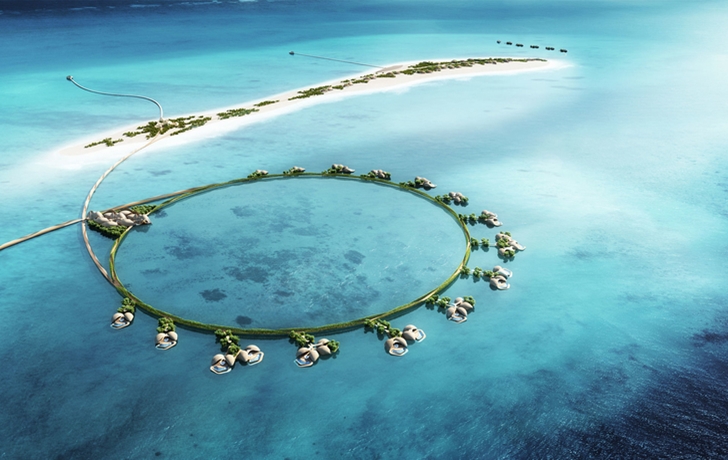 이 리조트는 움마핫 알샤이크 섬에 지어지는 것입니다. 이에 '움마핫 알샤이크 호텔 12'라는 가칭이 붙여져 있습니다. 이 리조트를 디자인한 곳은 바로 '포스터 앤 파트너스(Foster + Partners)'인데요. 이 건축 설계 회사는 유명한 건축가 노먼 포스터가 창립한 것으로 HSBC 홍콩 본점 빌딩, 홍콩 국제공항, 런던 밀레니엄 브릿지, 런던에서 가장 유명한 건물인 오이타워 등을 설계하며 명성을 쌓은 회사입니다. 포스터 앤 파트너스에서는 반지 모양의 리조트 디자인을 공개했는데요. 반지의 스톤에 해당하는 곳에는 리셉션과 식당 등을 배치해두고, 원형의 산책로를 따라 워터 방갈로를 하나씩 배치해두었습니다.