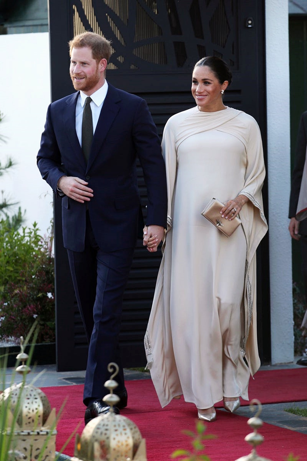 모로코 리셉션에 참석한 메건 마클의 모습입니다. 메건 마클은 이 날 크림색 컬러의 커스텀 디올 드레스를 착용하고 마치 여신과 같은 자태로 나타났습니다. 이 드레스는 지중해 동부 지방 나라에서 입었던 상의인 카프탄에서 영감을 받은 디자인으로 이루어져 있는 것이 특징적입니다.