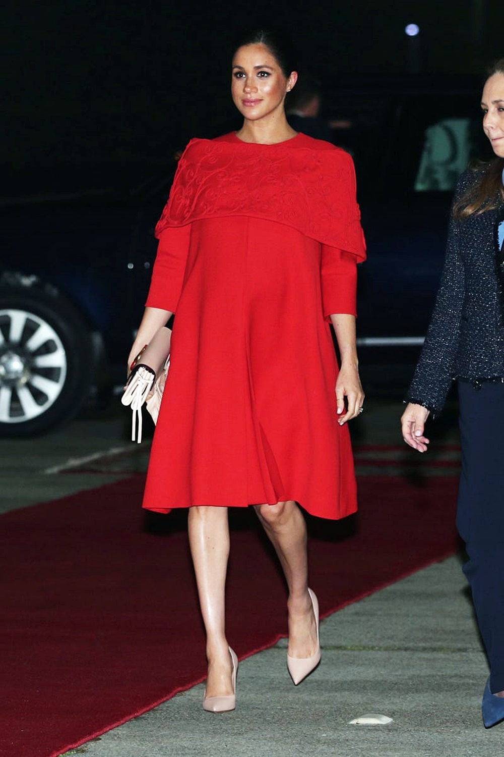 임신한 몸을 이끌고 모로코 로열 투어에 나선 메건 마클은 빨간색 발렌티노 드레스를 입으며 큰 화제가 됐습니다. 이 드레스는 어깨에 오버레이 디자인이 있으며 꽃자수가 놓여 있어 더욱 여성스러운 무드를 보여주고 있네요.