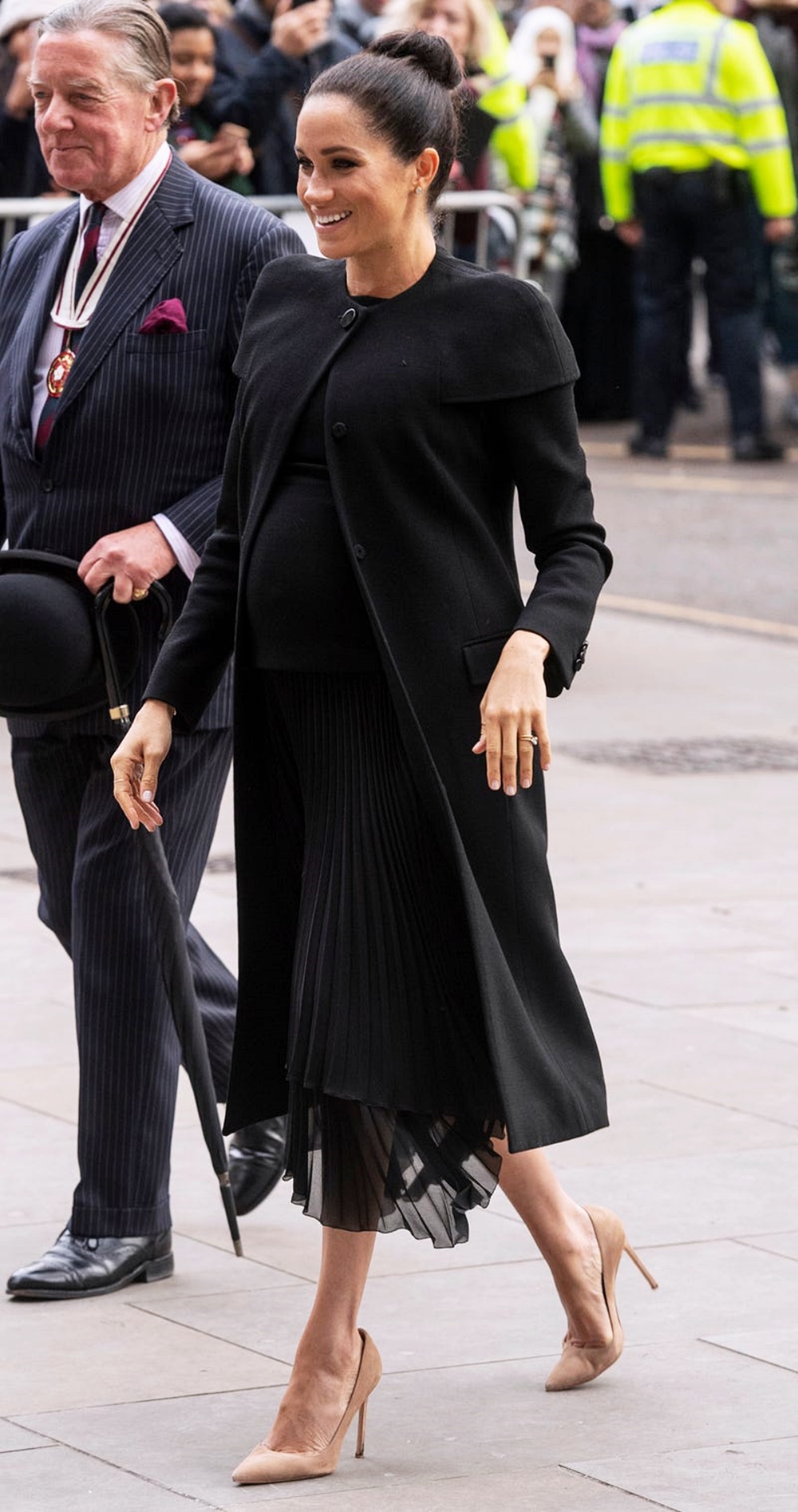 영국 디자이너 아만다 웨이클리의 1,190 달러 상당의 크림색 코트를 입은 메건 마클입니다. 코트 안에는 캘빈 클라인의 원피스를 입었네요. 클러치와 힐의 색상을 매치해 통일성 있는 스타일링을 완성했습니다.
