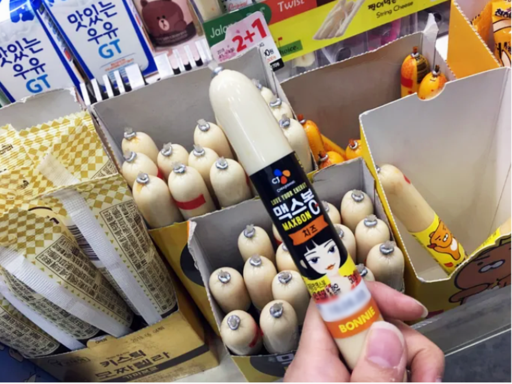 껍질을 벗겨 먹는 소시지 또한 인기 제품입니다. 이들은 특히 소시지를 컵라면에 곁들여먹는 것을 좋합니다.