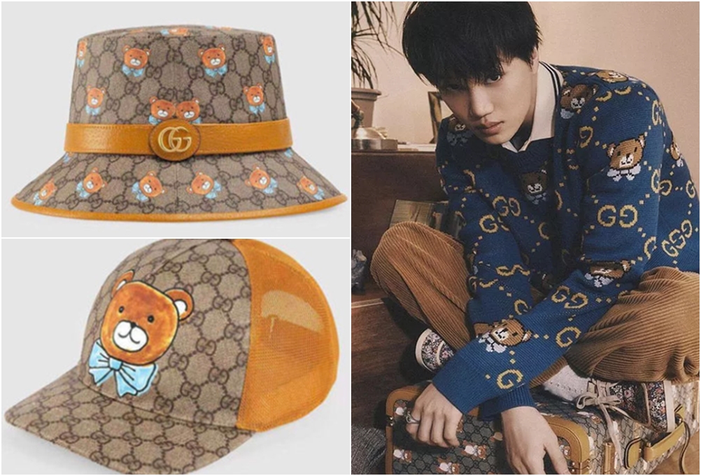 이번 컬렉션은 구찌의 100주년을 기념해 만들어졌는데요. 한국 연예인들 중에서는 카이가 최초로 이름을 딴 컬렉션의 주인공이 되었습니다. 이번 컬렉션의 디자인 포인트는 바로 '곰'입니다. 미키마우스, 도라에몽 컬렉션처럼 곰돌이가 GG 프린트 안에 반복적으로 들어가 있는 것이죠. 이 곰돌이는 마치 도화지에 대충 그린 듯 정겨운 핸드메이드 같은 모습인데요. 이에 더욱 레트로 무드를 느낄 수 있습니다.