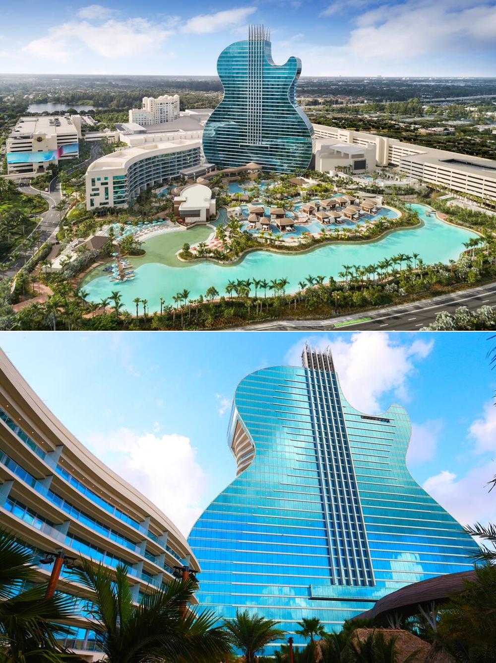 2019년 문을 연 '세미놀 하드락 호텔 앤 카지노'는 세계 최초의 기타 모양 호텔로 유명세를 떨쳤습니다. 이 호텔의 건축비는 우리 돈으로 약 1조 7,800억 원이라는 것이 알려지며 또 한번 화제가 되었죠. 기타 호텔 건축의 하이라이트는 바로 조명쇼인데요. 매일 9시와 9시 30분에 건물 외관에 있는 LED 조명으로 멋진 쇼를 보여주고 있습니다. 또한 건물의 꼭대기에서는 2만 피트 상공으로 6개의 라이트빔을 쏘며 엄청난 스케일을 자랑하고 있습니다.