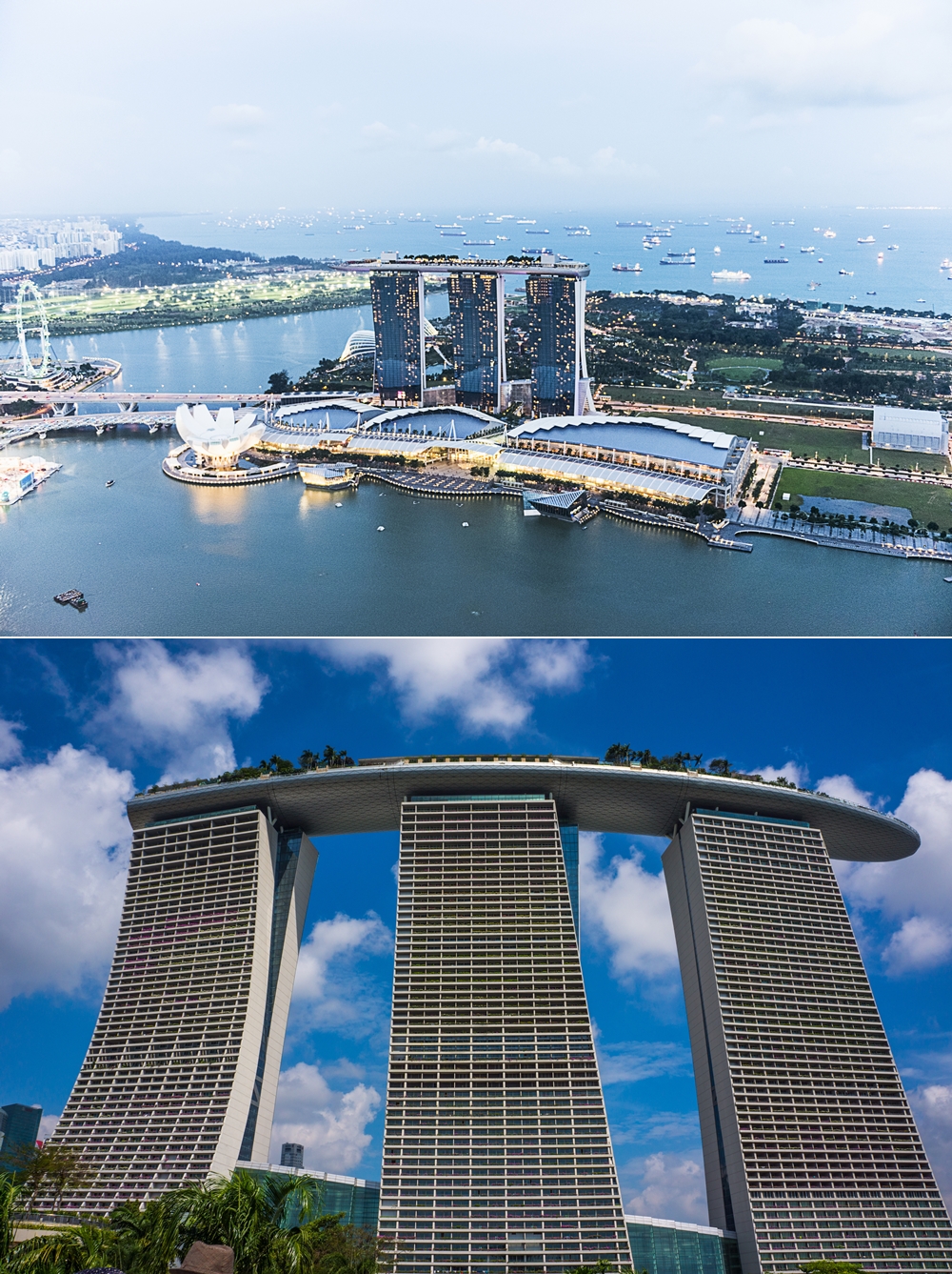 이제는 싱가포르의 상징이 되어버린 '마리나 베이 샌즈'의 모습입니다. 마리나 베이 샌즈는 3개의 타워에 범선 모양의 샌즈 스카이파크가 얹혀 있는 모양입니다. 사실 이 설계는 당시 기술로서는 감당하기 힘든 구조였는데요. 그럼에도 우리나라의 건설사인 쌍용 건설이 이를 도면 그대로 구현해 내며 더욱 화제가 되었습니다.
