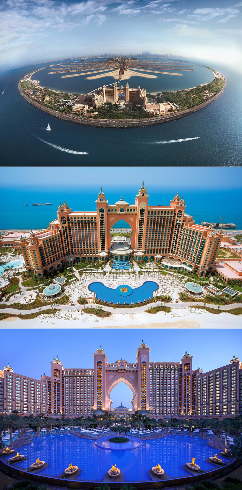 두바이에 위치한 '아틀란티스 더 팜'은 마치 신화 속의 도시 아틀란티스가 걸프만에서 나와 두바이 해안에 안착한 것 같은 신비한 자태를 뽐내고 있습니다. 이 호텔의 타워 중앙에는 스페이드 모양의 구멍이 있는데요. 더욱 신비로운 느낌을 자아내고 있네요.