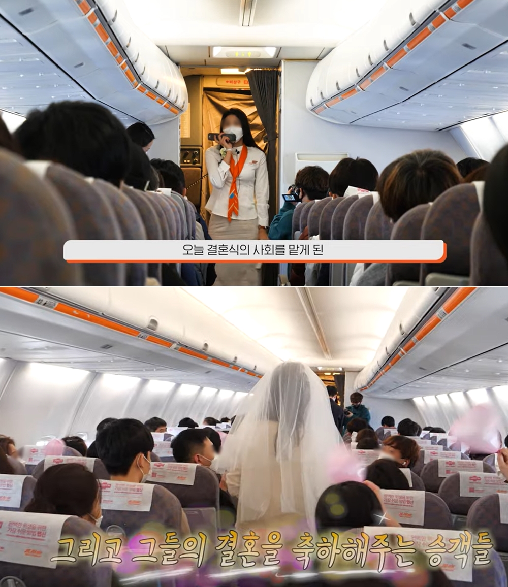 제주항공에서는 이들을 위해 깜짝 이벤트도 열었는데요. 바로 기내에서 간소하지만 의미있는 결혼식을 진행한 것이었습니다. 이벤트에 당첨된 커플은 비행기의 가장 뒷 좌석에 앉아 있었는데요. 비행기가 이륙한 후 안정적인 고도에 도달하자 신랑과 신부는 비행기의 뒤편에서 결혼식 준비를 했습니다. 신랑은 부토니아를 꽂고, 신부는 부케를 들었죠. 또한 신부는 티아라와 베일을 썼는데요. 이후 비행기의 복도를 버진로드 삼아 걸었습니다.