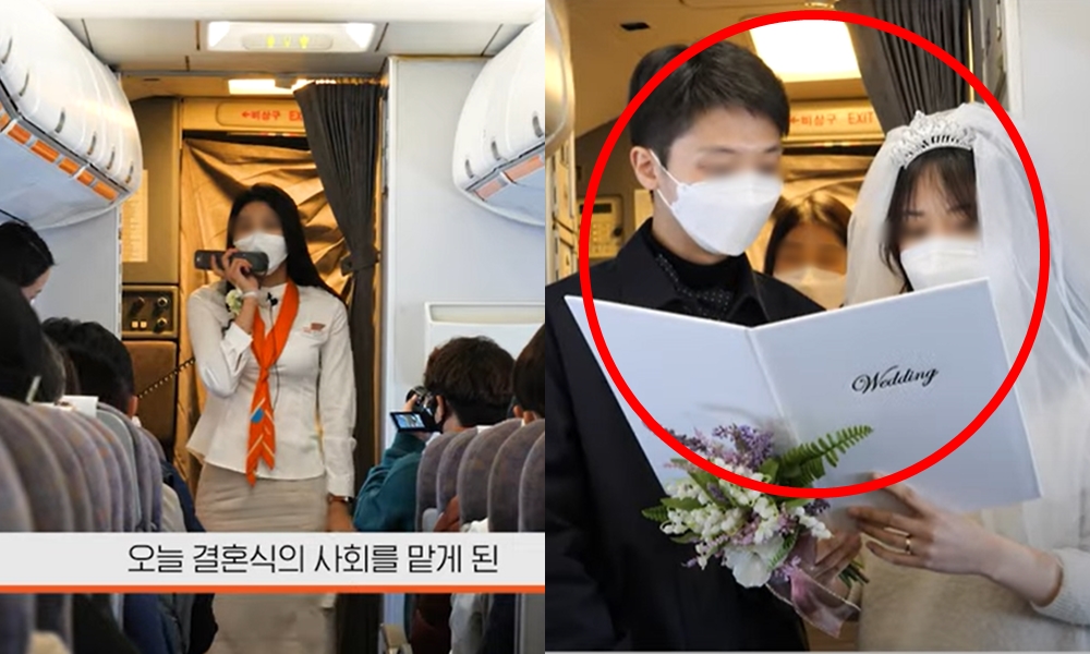 제주항공에서는 이들을 위해 깜짝 이벤트도 열었는데요. 바로 기내에서 간소하지만 의미있는 결혼식을 진행한 것이었습니다. 이벤트에 당첨된 커플은 비행기의 가장 뒷 좌석에 앉아 있었는데요. 비행기가 이륙한 후 안정적인 고도에 도달하자 신랑과 신부는 비행기의 뒤편에서 결혼식 준비를 했습니다. 신랑은 부토니아를 꽂고, 신부는 부케를 들었죠. 또한 신부는 티아라와 베일을 썼는데요. 이후 비행기의 복도를 버진로드 삼아 걸었습니다.