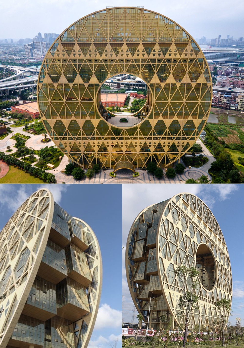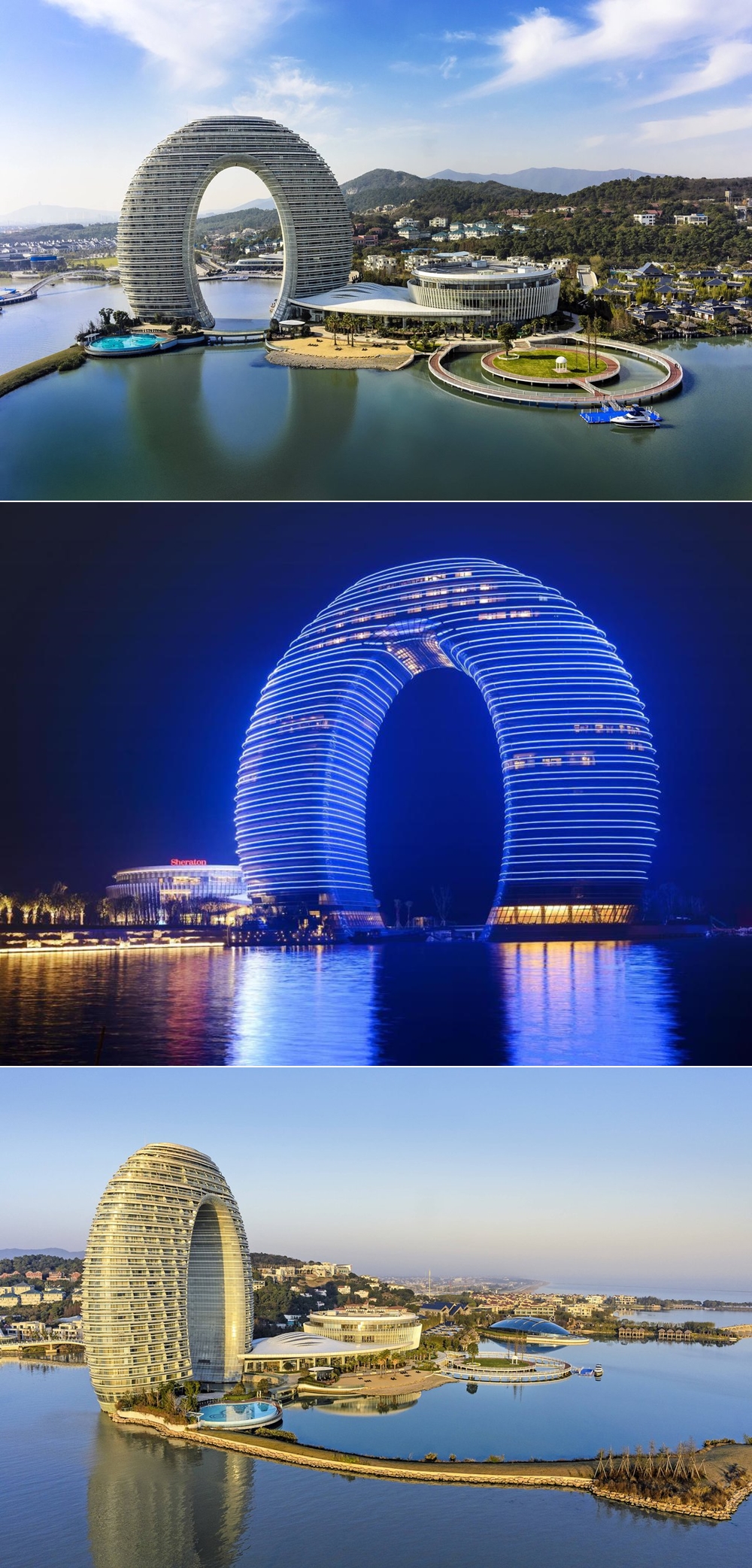 상하이와 난징 사이의 타이(Tai) 호수변에는 도넛 같기도, 혹은 말발굽 같기도 한 거대한 27층짜리 건물이 들어서 있습니다. 이는 321개의 방, 4개의 레스토랑을 갖추고 있는 호텔입니다. 이 건물은 밤이 되면 사람들의 시선을 더욱 잡아끌고 있습니다. 빌딩이 여러 개의 색상으로 불을 밝히기 때문입니다. 이 건축물은 베이징에서 활동하고 있는 건축가 마옌송이 설계한 것입니다.