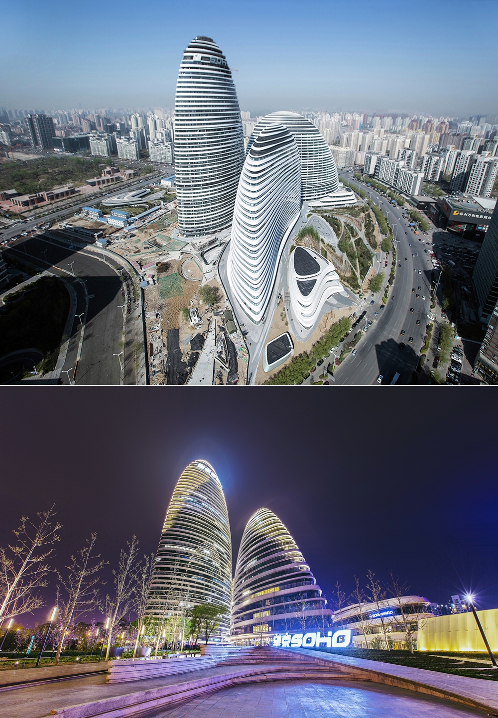 산봉우리 세 개가 모여있는 모양을 하고 있는 이 건물은 베이징에 위치한 왕징소호입니다. 이 건축물은 자하 하디드가 설계한 것이며 2014년 완공되어 지금까지도 베이징의 랜드마크로 자리 잡고 있죠.