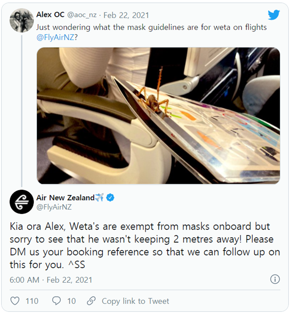 이 게시글이 화제가 되자 뉴질랜드항공에서는 직접 나섰습니다. 뉴질랜드 항공에서는 '웨타는 마스크를 안써도 되지만 사회적 거리 두기를 하지 않은 것을 보니 유감이다'라고 말했는데요. 이후 이 승객에게 예약 번호를 알려달라며 이 사건에 대해 보상하겠다고 제안하기도 했죠. 또한 웨타는 멸종 위기에 있는 종으로 자연으로 돌려주었다는 선택은 매우 옳은 것이라고 밝혔습니다.