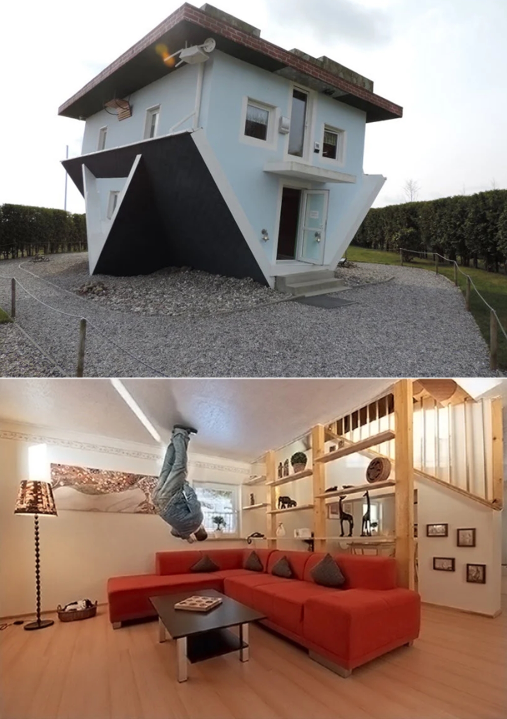 두 번째는 독일에 위치한 디벨트슈테트코프(Die welt steht kopf)입니다. 이 표현은 '세계가 뒤집혔다'라는 뜻인데요. 이곳은 유럽에서 가장 사진이 많이 찍힌 주택이라고 하네요. 이곳은 최초로 가구까지 뒤집어 전시한 곳이기도 하죠. 이 집은 2년간의 계획과 건축을 거쳐 2008년 완공되었으며 디자이너 게시네 랑에(Gesine Lange)가 설계했습니다.