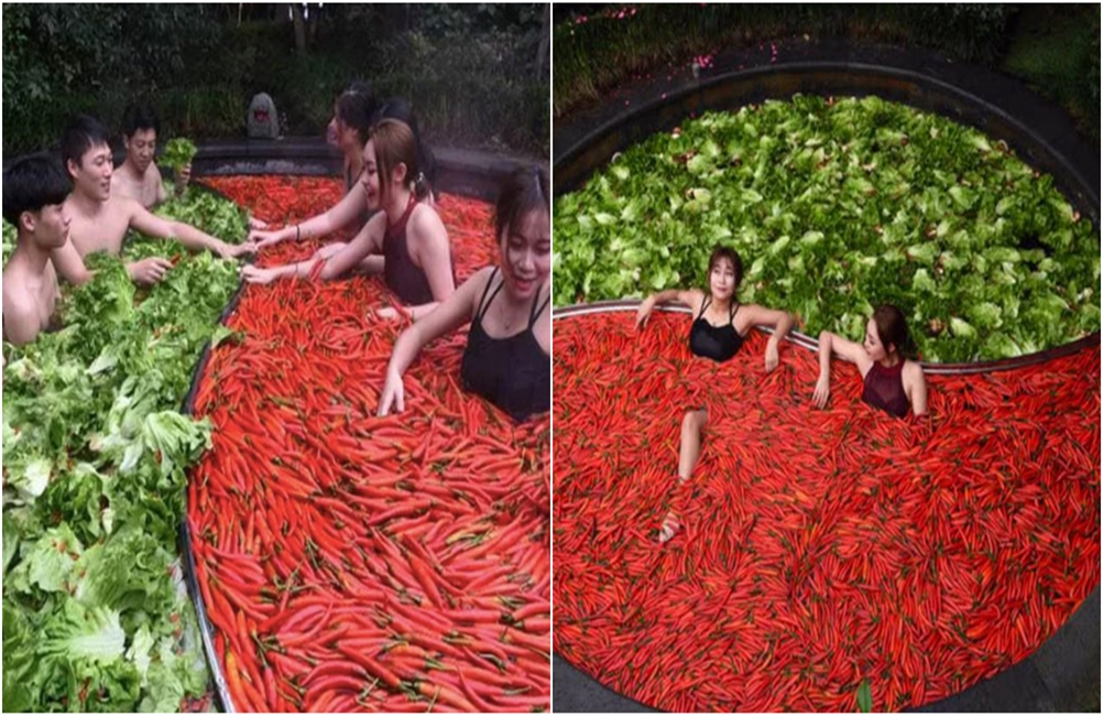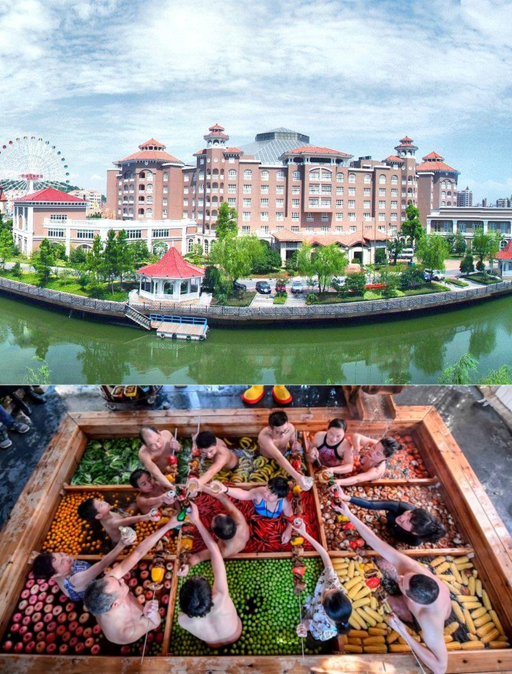 더 퍼스트 월드 호텔에서는 이 이벤트를 위해 온천탕을 특별 제작했습니다. 이곳에는 진짜 훠궈 냄비처럼 생긴 원형 온천을 만들어 두 개로 나눴으며, 사각형의 온천을 9개의 칸으로 나누기도 했죠. 그리고 이 탕에는 뜨끈한 온천수를 채워 넣고, 고추, 상추, 버섯, 옥수수, 사과, 바나나, 금귤 등 채소와 과일을 띄워 사람들이 즐겁게 온천욕을 즐길 수 있도록 했습니다.