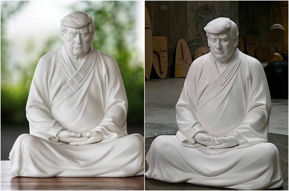 얼마 전 중국의 알리바바 그룹이 운영하는 중국 최대 전자상거래 플랫폼 타오바오에는 기상천외한 상품이 올라왔습니다. 바로 스님과 같은 복장을 하고 양반다리를 하고 앉아 눈을 감고 두 손을 배꼽에 가지런히 모으며 명상을 하는 도널드 트럼프 미국 전 대통령의 동상이었습니다. 이 동상은 세라믹으로 만들어졌으며 화이트 컬러로 되어 있어 차분한 느낌을 자아내고 있습니다.