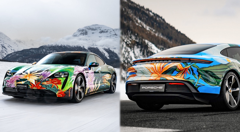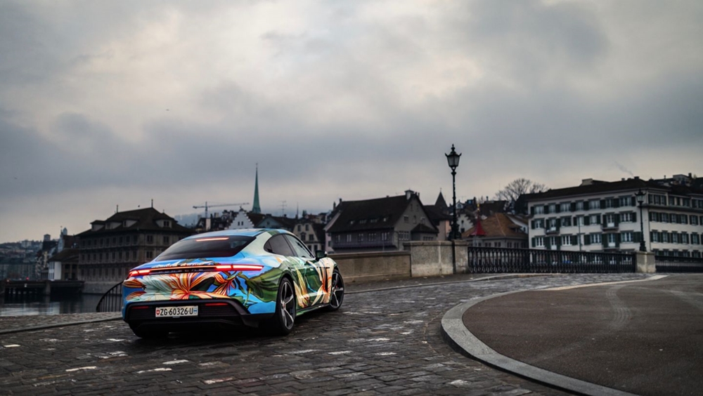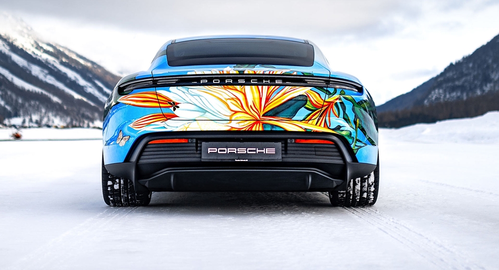 먼저 리처드 필립스는 자동차의 각 부분에 들어갈 그림의 디자인을 맡았습니다. 사실 작품 '밤의 여왕'은 스위스의 풍경화가 아돌프 디트리히(Adolf Dietrich)의 작품에 영감을 받아 만든 작품인데요. 스위스의 청명한 하늘과 스위스에서 피는 꽃들, 특히 밤에 피는 꽃들을 묘사한 작품입니다. 이에 차량의 루프 부분에는 하늘과 나비가, 그리고 옆면과 앞면에는 꽃과 식물이 그려져 있네요. 그리고 이 그림을 타이칸으로 옮기는 것은 독일의 차량 랩핑 전문 회사 '시그널 디자인(Signal Design)'이 맡았습니다.