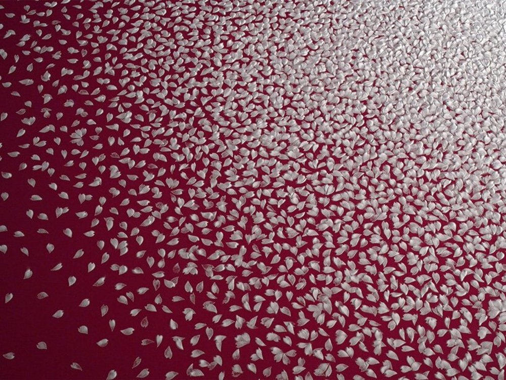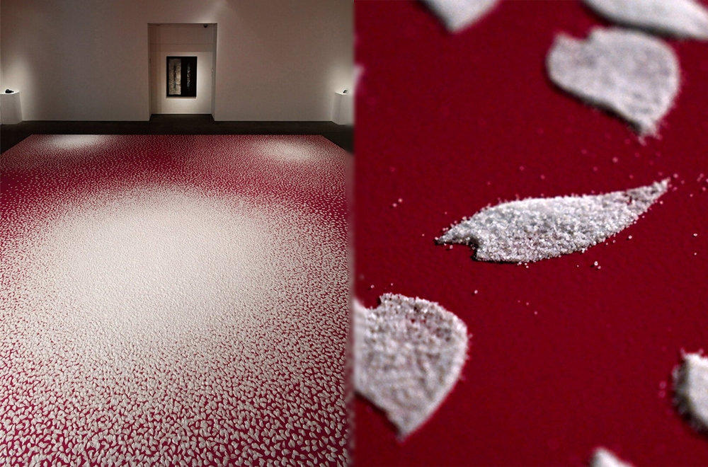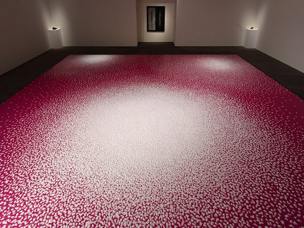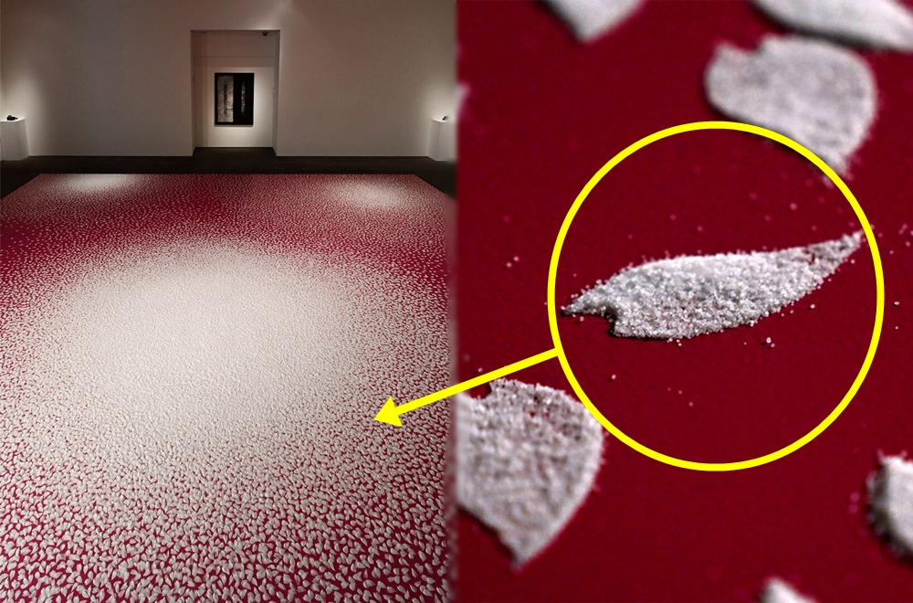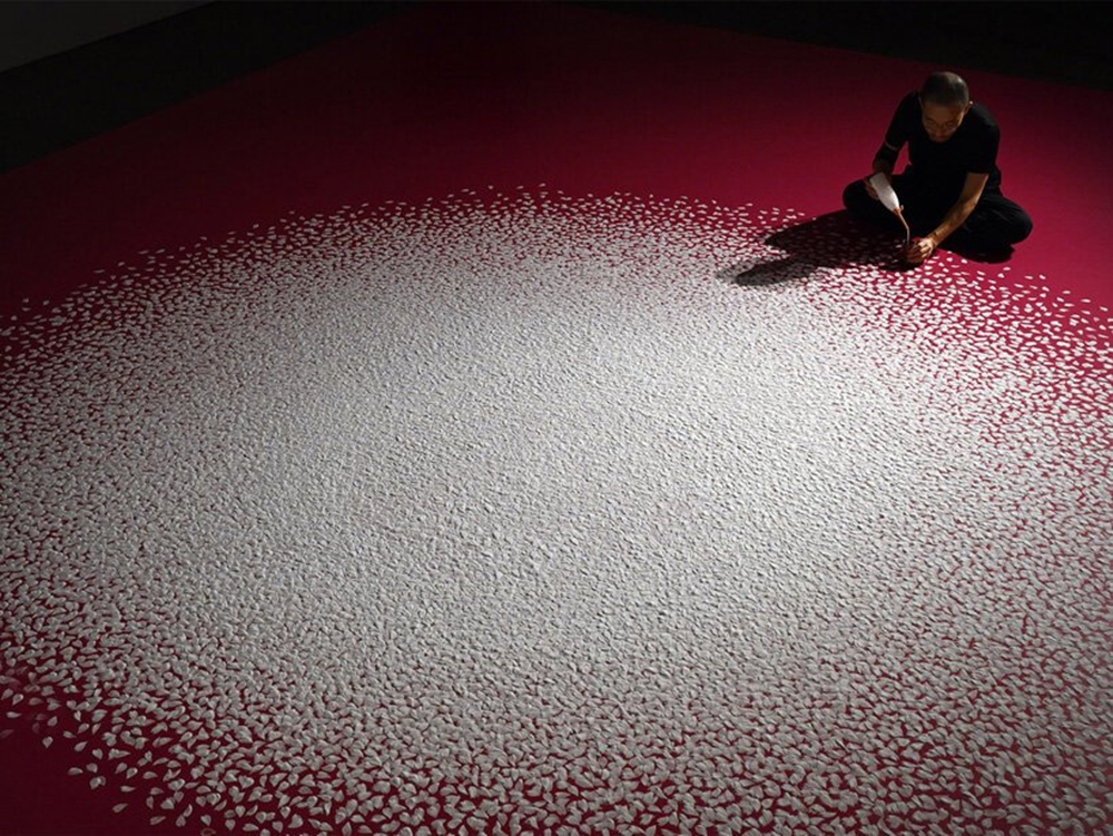 바로 이 작품은 진짜 벚꽃잎이 아닌 소금으로 만들어진 것입니다. 벚꽃 모양의 틀에 소금을 넣어 벚꽃 모양으로 바닥에 소금을 뿌린 것이었죠. 그는 10만개의 소금 벚꽃잎을 만들어 이를 배치했고, 이 과정은 55시간, 9일 정도가 소요되었죠. 즉 하루에 1만 개 이상의 소금 벚꽃잎을 만들어냈다는 뜻입니다.