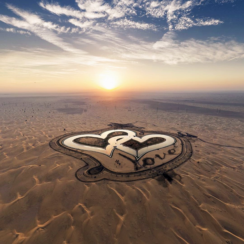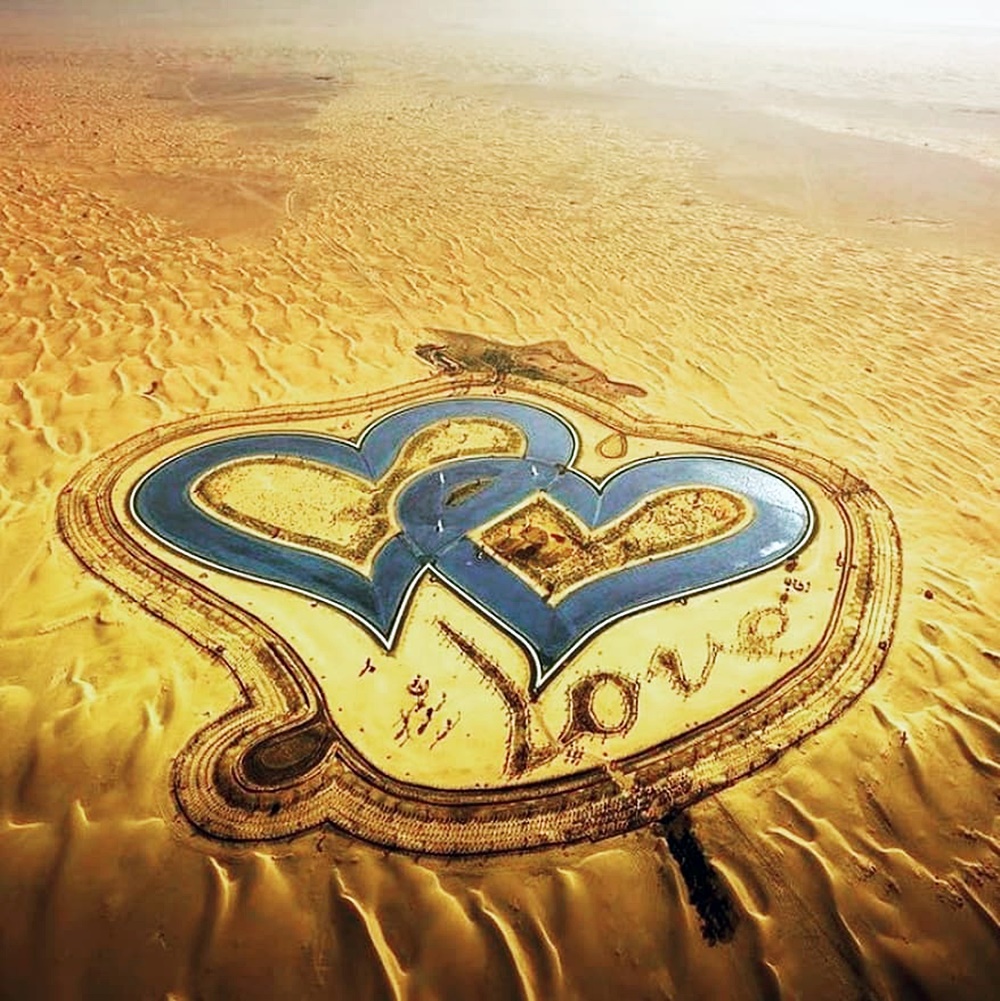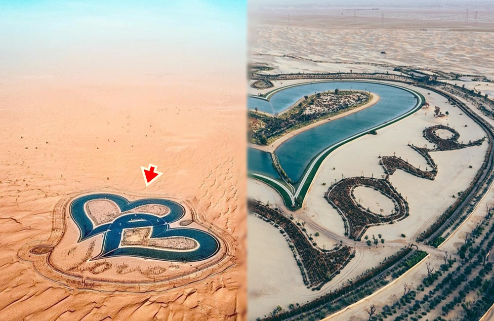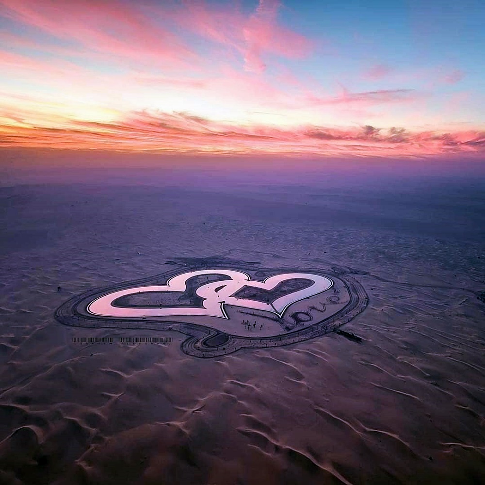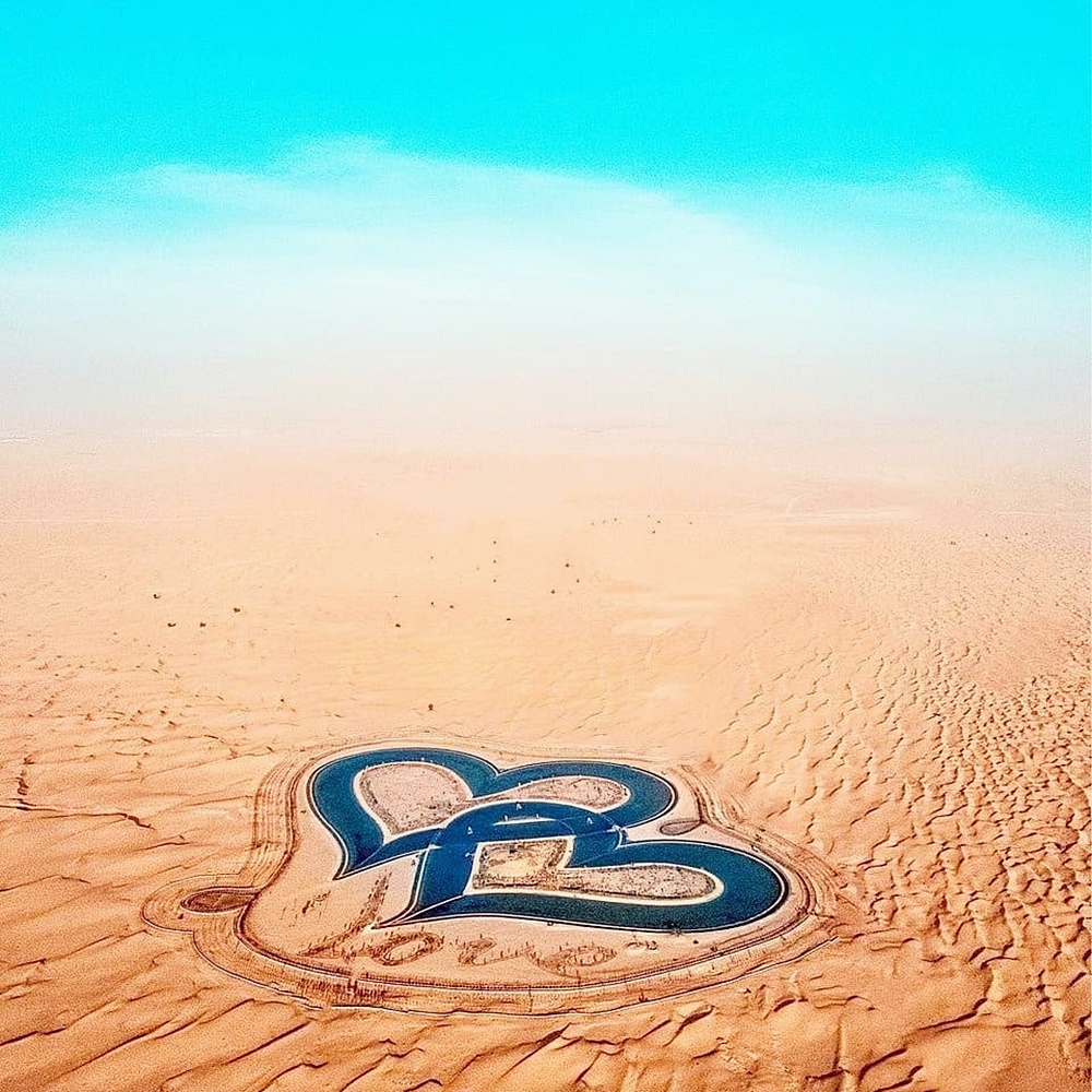 이 호수는 알콰드라 오아시스 근처에 위치하고 있는데요. 두 개의 하트 모양이 서로 얽힌 모양으로 무려 55만 평방미터, 약 16만 6천 평에 해당하는 크기이죠. 이는 국제 기준의 축구장 약 78개의 크기라고 하니 엄청난 규모에 놀라지 않을 수 없습니다. 이곳에는 하트 모양의 호수 외에도 수십만 그루의 관목과 16,000그루가 넘는 나무, 그리고 하트 모양으로 심어진 붉은 베고니아를 포함한 수천 송이의 다채로운 꽃들로 이루어져 있습니다.