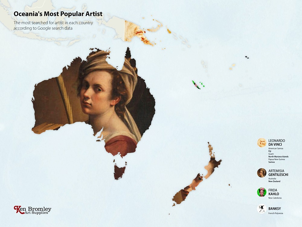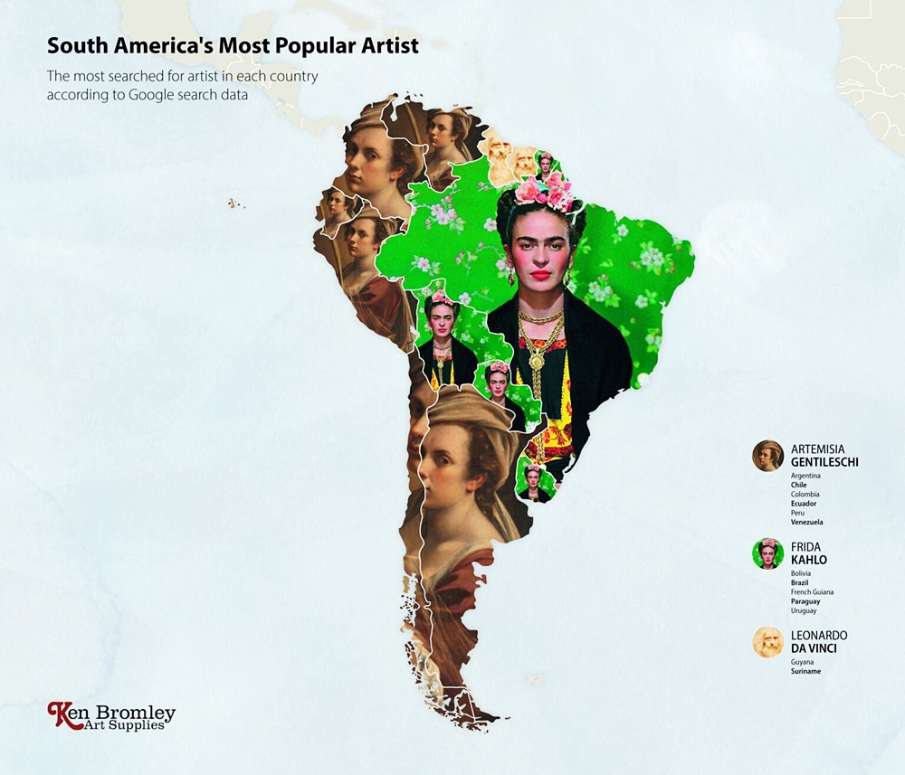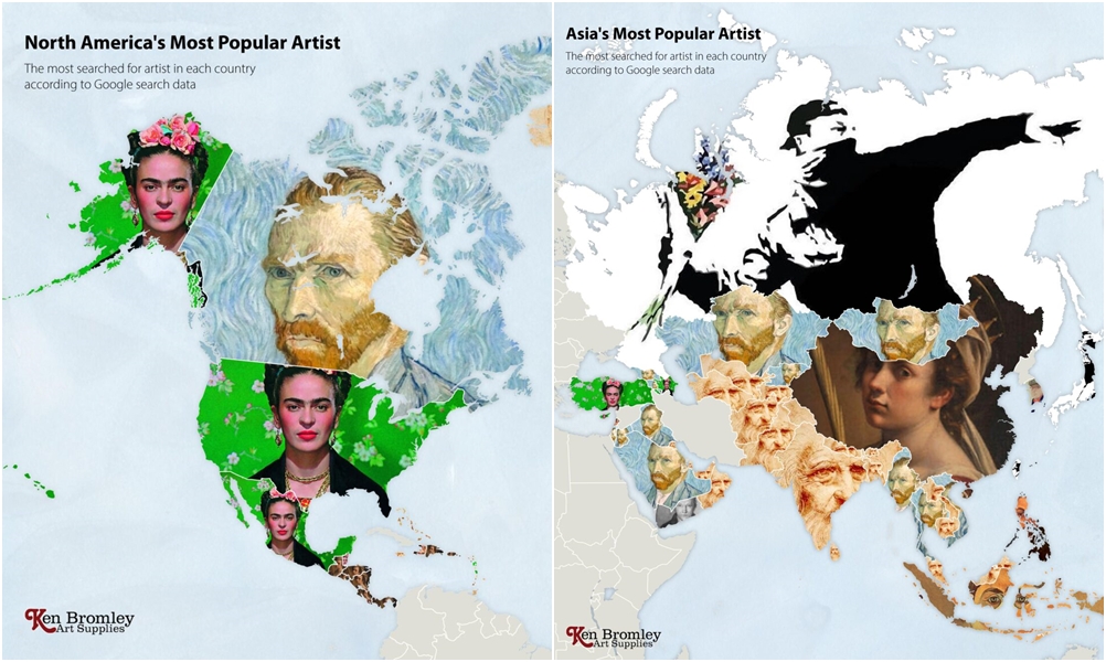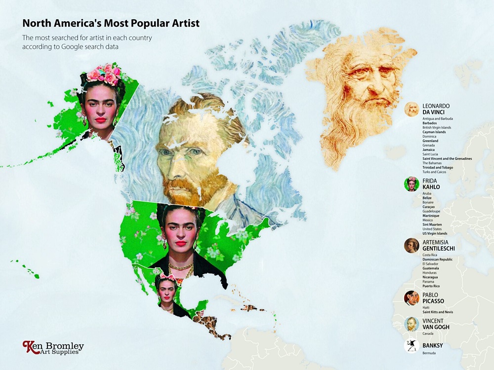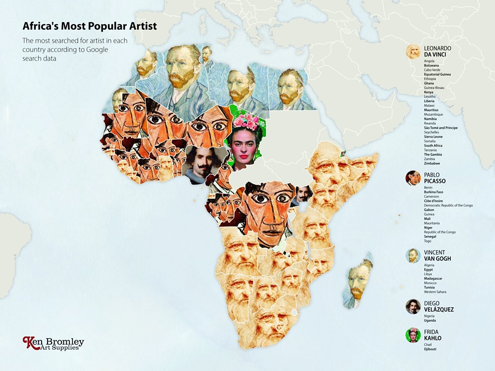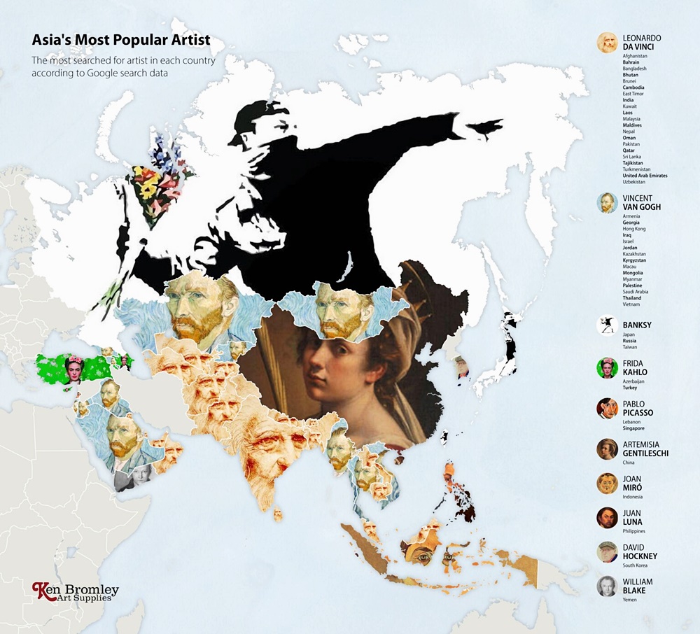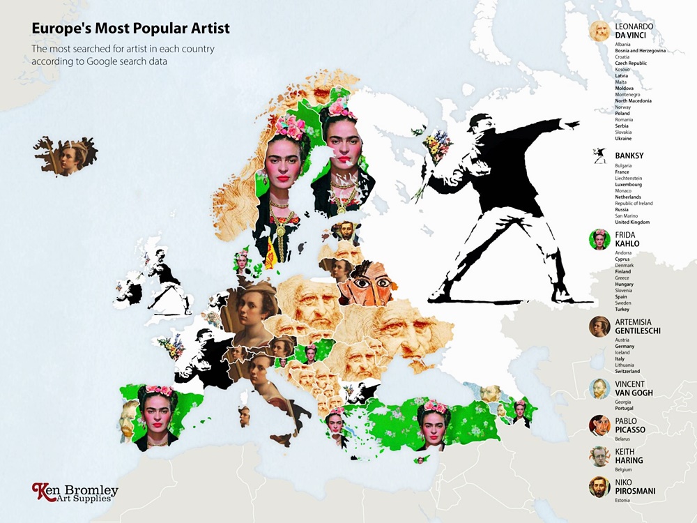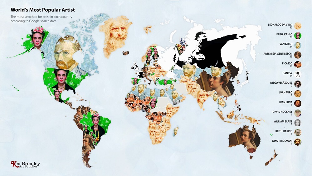 2020년 최악의 전염병으로 박물관, 미술관, 갤러리는 문을 닫았습니다. 그리고 많은 미술 애호가들은 온라인을 통해 그림을 볼 수밖에 없었죠. 한 회사는 이에 아이디어를 얻어 전 세계 각국에서 사랑하는 예술가들을 찾아보기로 했습니다. 이들은 구글의 빅데이터를 이용해 나라별로 가장 많이 찾아본 예술가가 누구인지 본 것이죠. 바로 켄 브롬리 아트 서플라이(Ken Bromley Art Supplies)입니다.