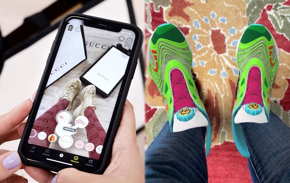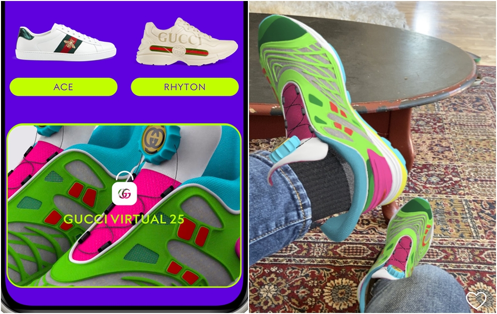 이 운동화는 AR 패션 플랫폼 워너(Wanna)와 함께 만든 것인데요. 디지털 세계에만 있는 운동화이지만 이를 신어보기 위해서는 구찌의 모바일앱을 통해 9달러에서 12달러의 금액으로 구매해야만 합니다. 돈을 지불하고 이 운동화를 구매하면 마치 카메라 앱의 페이스 필터처럼 운동화를 신은 자신의 모습을 볼 수 있습니다. 그리고 이를 사진이나 영상으로 찍어 SNS에 올릴 수도 있죠. 또한 가상현실 소셜 플랫폼은 VR챗(VRChat)과 온라인 게임 로블록스의 아바타에 이 운동화를 신길 수도 있습니다.