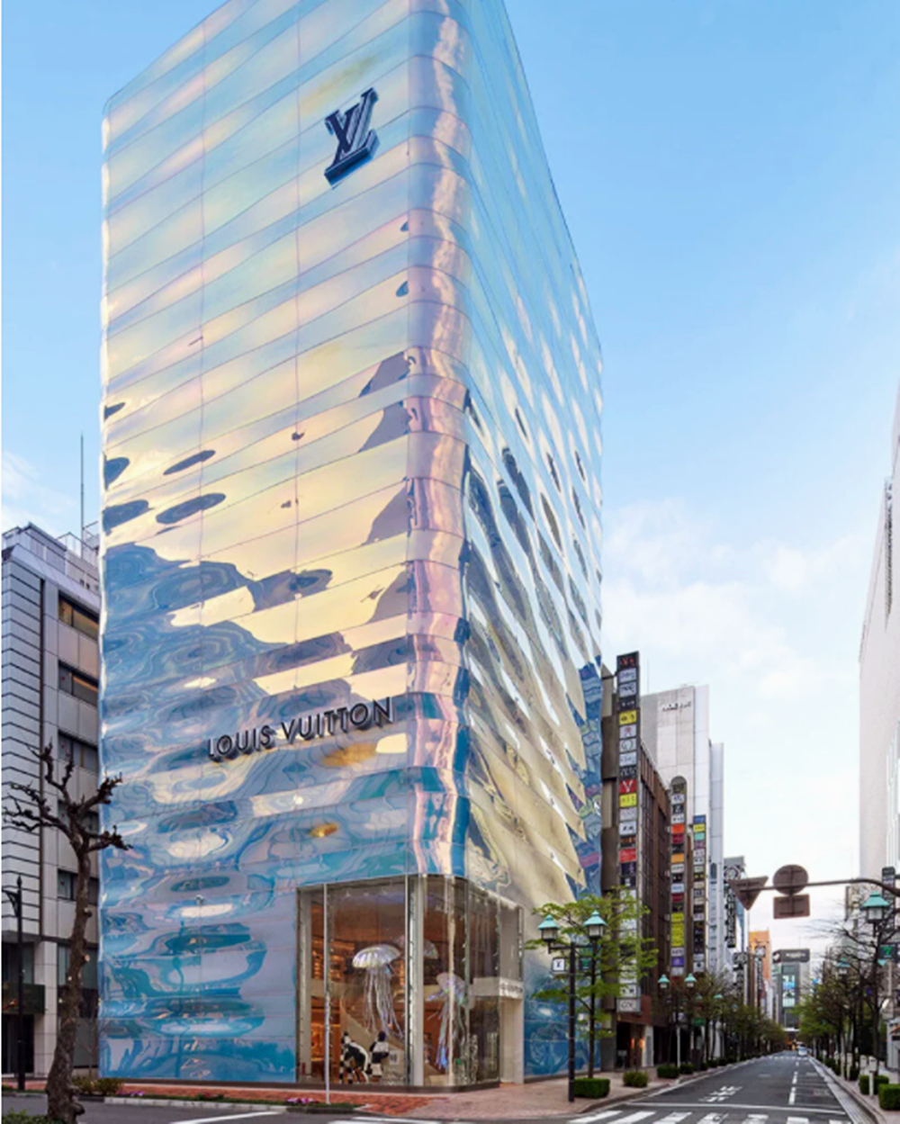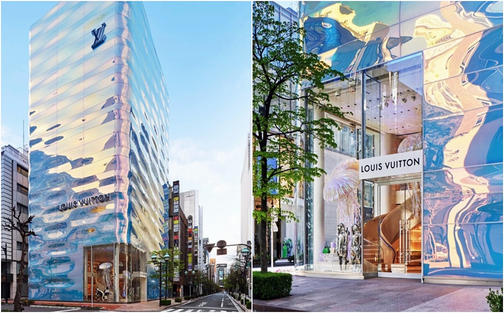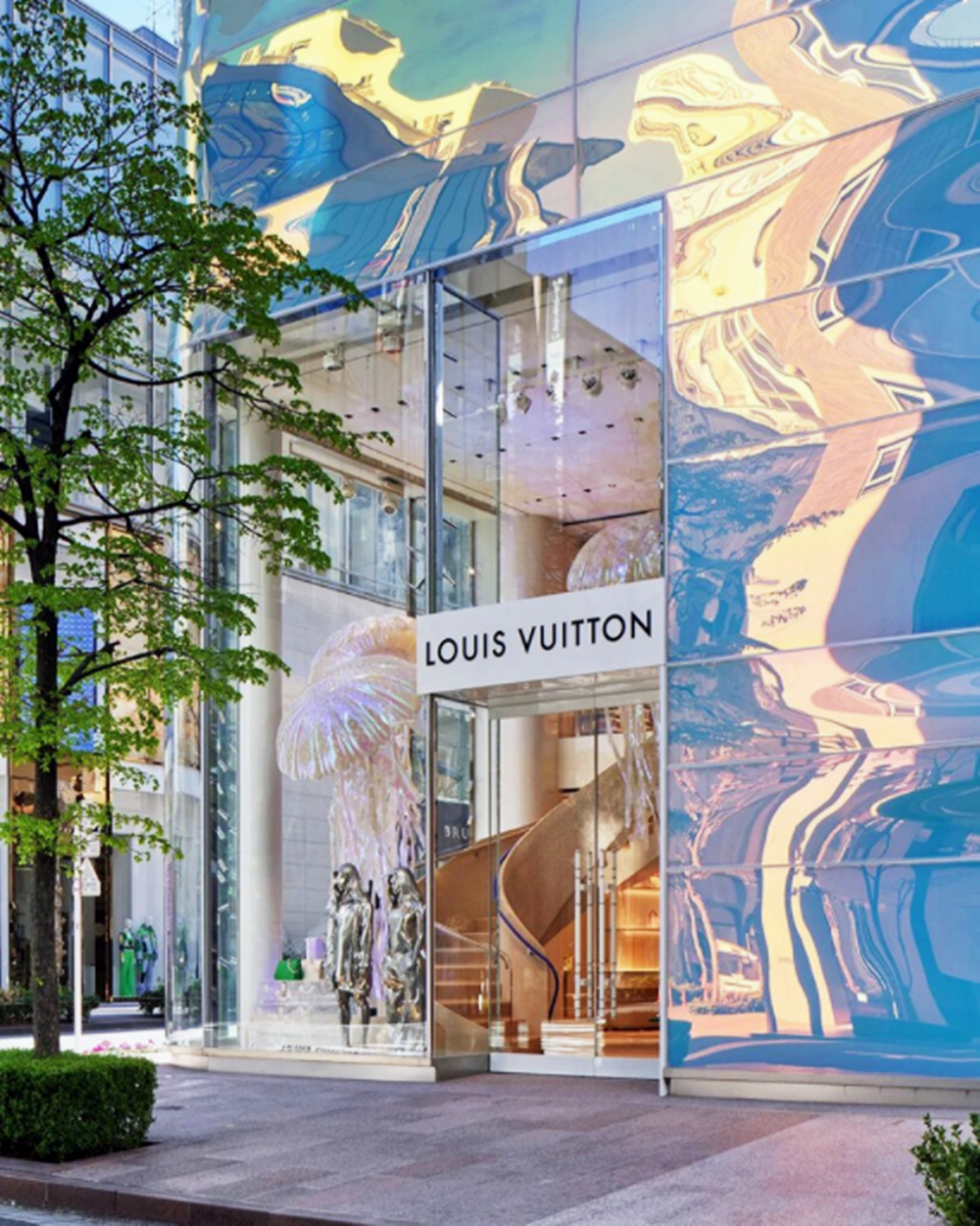 얼마 전 긴자의 나미키도리에는 루이비통 매장이 새롭게 문을 열었습니다. 이 매장은 한눈에 보기에도 예술적이고 화려한 자태를 뽐내고 있습니다. 이 매장은 총 7층으로 구성되어 있으며 매장 설계는 일본의 건축가 아오키 준(Jun Aoki)이 맡았죠. 매장의 외관은 물이 반사되는 색상에 영감을 받아 만들었다고 하는데요. 실제로 일렁이는 곡선이 특징적인 외관은 3D 효과가 반영되어 색상이 계속해서 달라지고 있습니다. 이 색상의 비결은 바로 다이크로익 필름입니다. 다이크로익 필름은 오로라 필름, 홀로그램 필름 등의 별칭을 가진 필름인데요. 무지개처럼 다양한 색상을 오묘하게 낼 수 있어 인테리어 디자인에 종종 사용되는 것이기도 합니다.