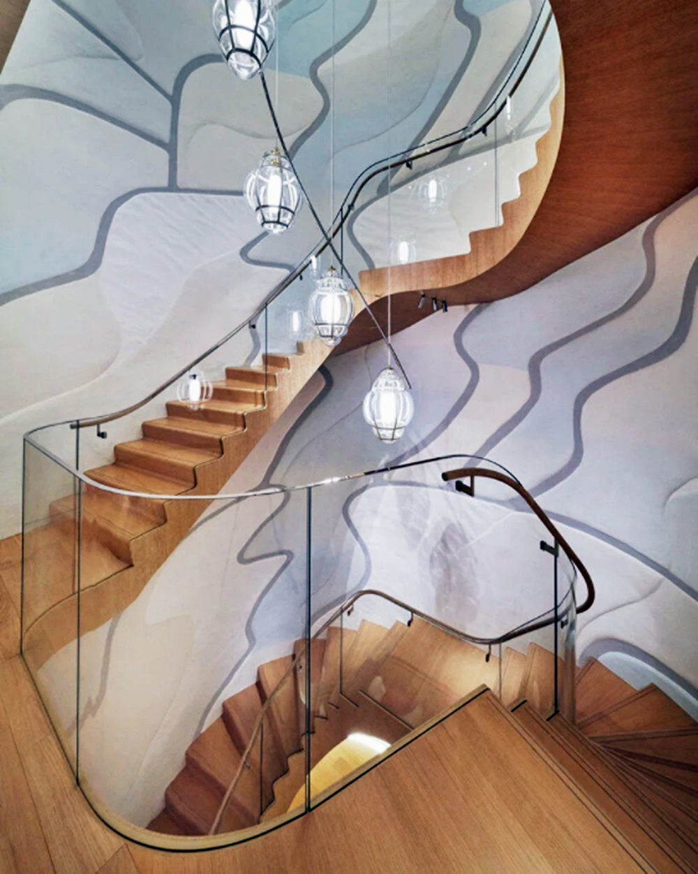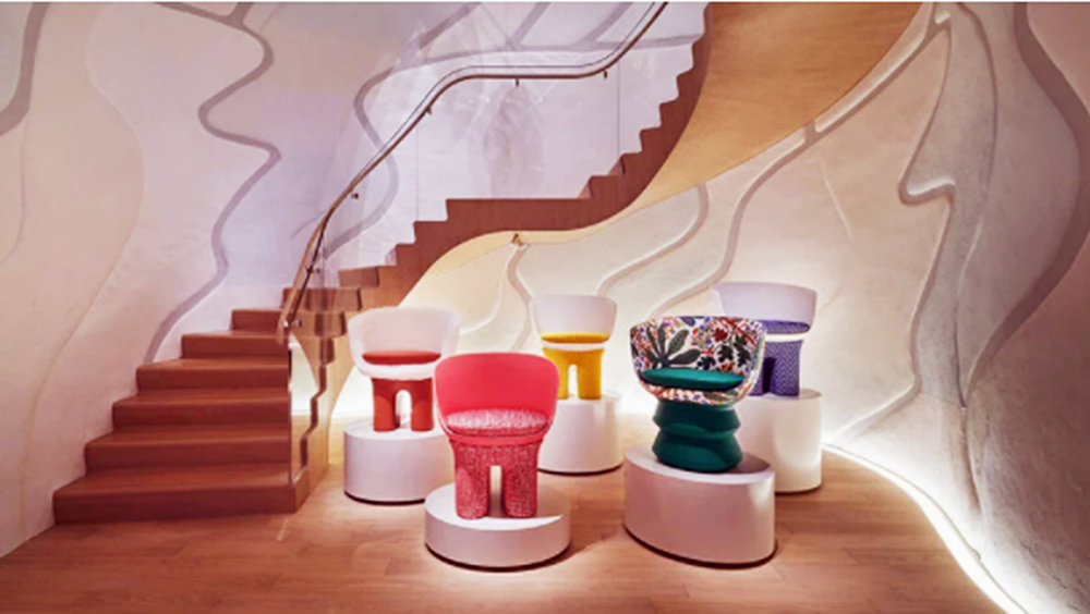 인테리어는 피터 마리노(Peter Marino)가 맡았습니다. 마리노는 인테리어를 통해 이 건축물의 유기적인 외관을 조금 더 강조하고 싶었다고 하는데요. 이에 건물 중앙에 있는 나무 계단에 중점을 두었으며, 다양한 색상을 사용했다고 하네요. 인테리어에는 프랑스를 대표하는 모던 디자이너인 피에르 폴랑과 비스포크 가구 디자이너 스테판 레오의 가구가 사용되었습니다. 계단 옆에 있는 4층 높이의 벽에는 키미코 후지무라의 그림이 재해석되어 그려져 있네요.