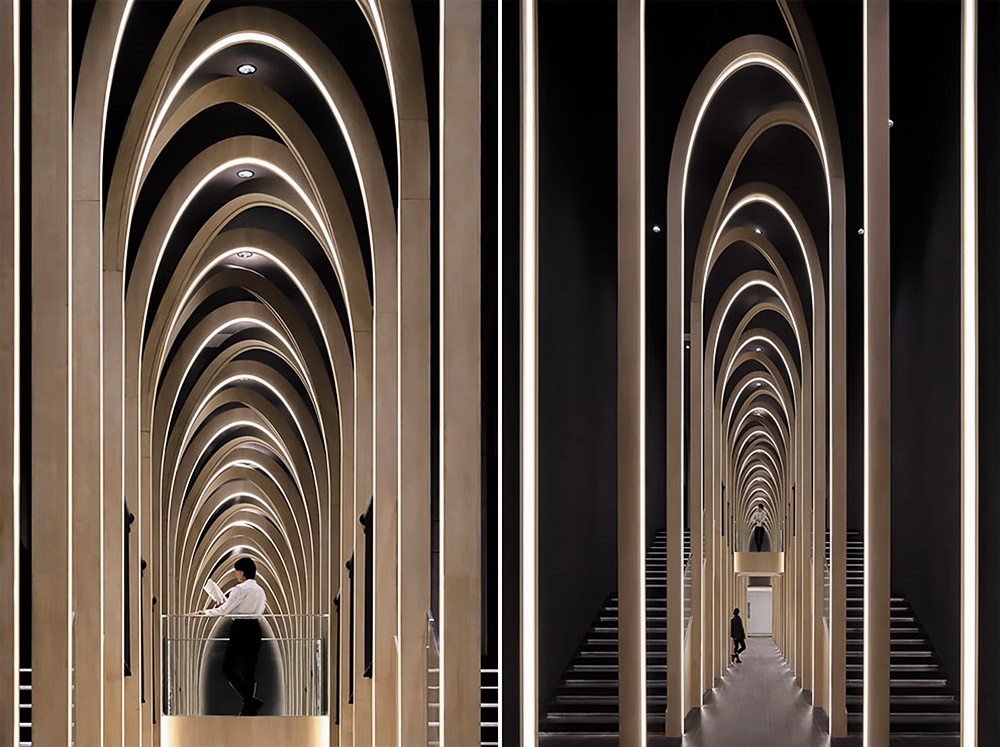 영화가 끝난 후 관객들은 서점 카페에서 음료를 즐길 수도 있습니다. 아마 관객들은 이곳에서 따뜻한 음료를 마시며 영화에 대한 이야기를 나눌 수 있겠죠. 영화관과 서점이 이어지는 복도에는 10미터 높이의 아치가 설치되어 있는데요. 매우 강렬한 시각효과를 주고 있네요.
