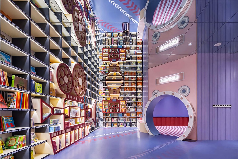 다른 중수거 서점들처럼 이곳도 멋진 디자인은 기본으로 장착하고 있습니다. 특히 이곳은 비현실적인 공간인 것 같은 느낌을 주기 위해 거울과 반사되는 재료를 사용하고 있는데요. 천장에는 거울이, 바닥에는 반짝반짝하는 타일을 있어 책장이 무한히 이어지는 듯한 느낌을 자아내고 있습니다. 바닥에서 천장까지 이어진 책장에서 사람들의 손이 닿는 곳에는 진짜 책이, 사람들의 손이 닿지 않는 높은 곳에 있는 책장에는 책 모형이 꽂혀있다고 합니다. 아이들을 위한 공간도 있습니다. 이 공간 또한 영화를 테마로 만들어졌는데요. 프로젝터, 촬영 카메라, 필름 등의 디자인을 차용해 작은 영화 세상을 만들었습니다.