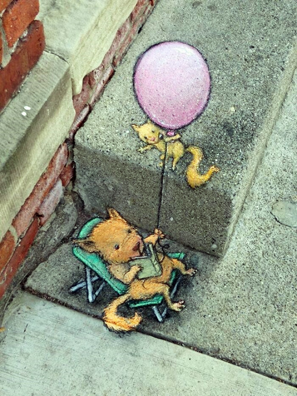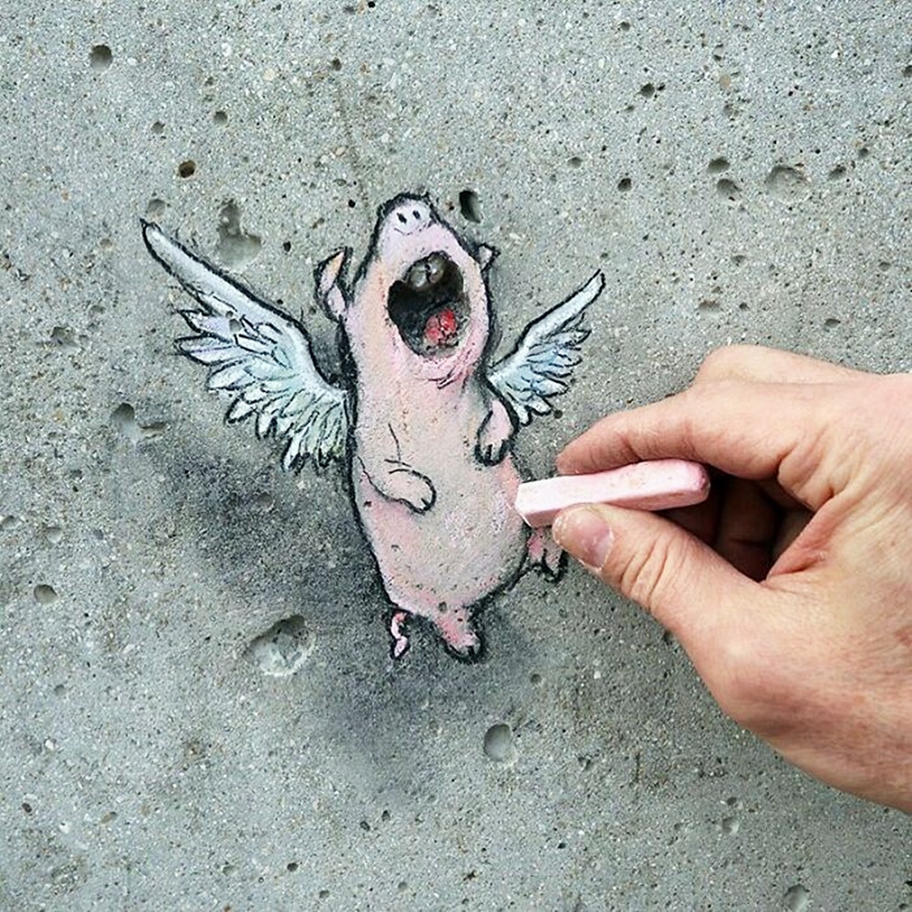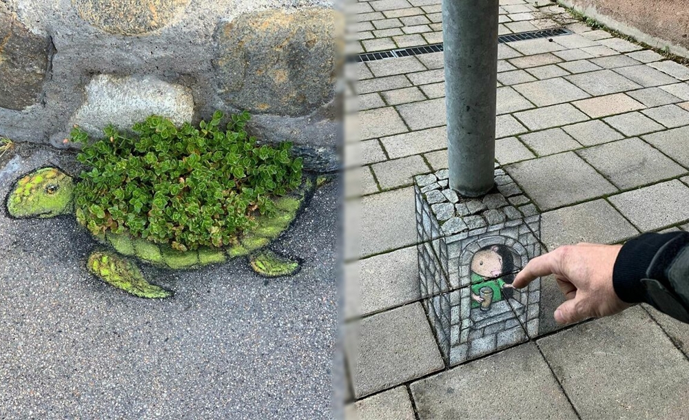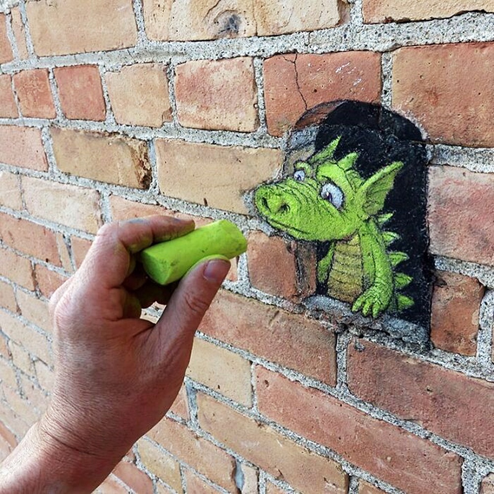 미국 미시간 주의 앤아버에서 활동하고 있는 아티스트 데이비드 진(David Zinn)은 '사라지는 예술'로 유명합니다. 그는 길거리에 분필과 차콜(목탄)만으로 그림을 그리고 있는데요. 이에 시간이 지나거나 비가 오면 그의 그림은 사라져 버리기에 '사라지는 예술'이라는 별칭이 붙었습니다. 그는 길거리를 다니다 얼룩진 콘크리트, 금이 간 벽, 구멍, 작은 틈 등을 놓치지 않고 그림의 소재로 삼고 있습니다. 그리고 귀여운 몬스터들을 매치해 귀여운 그림을 그리고 있습니다.