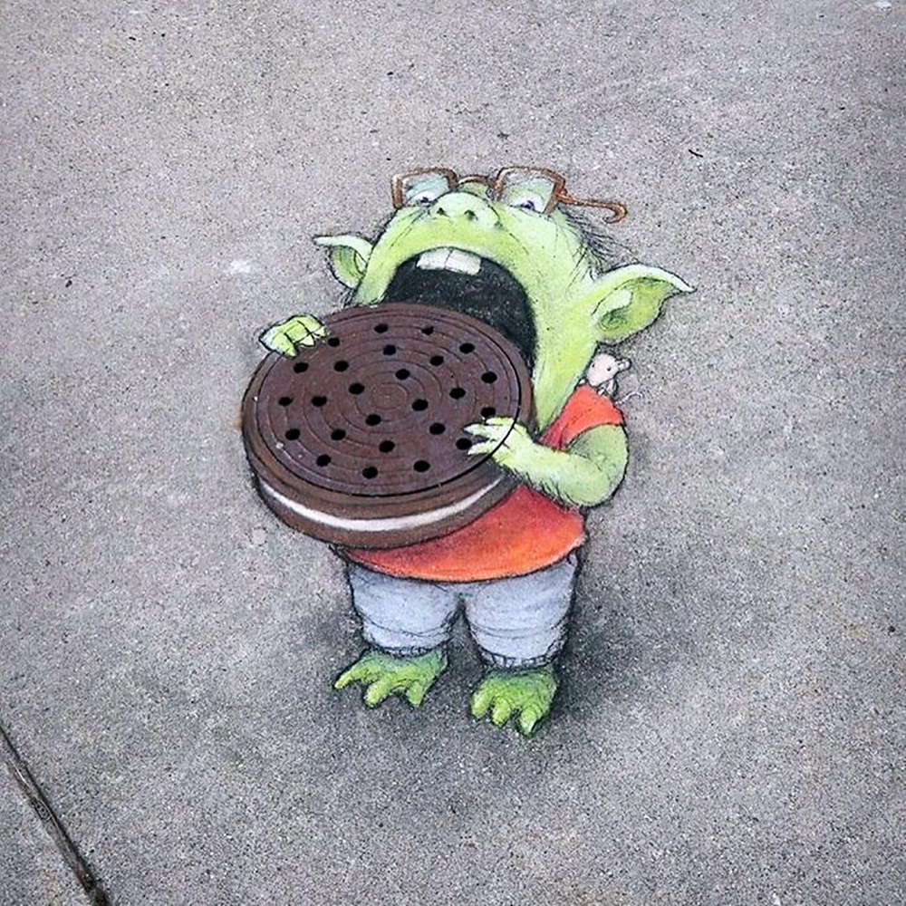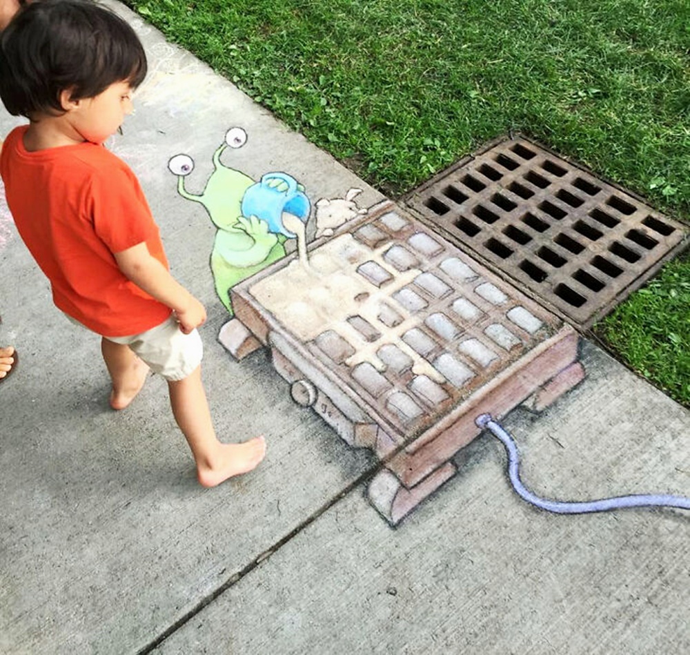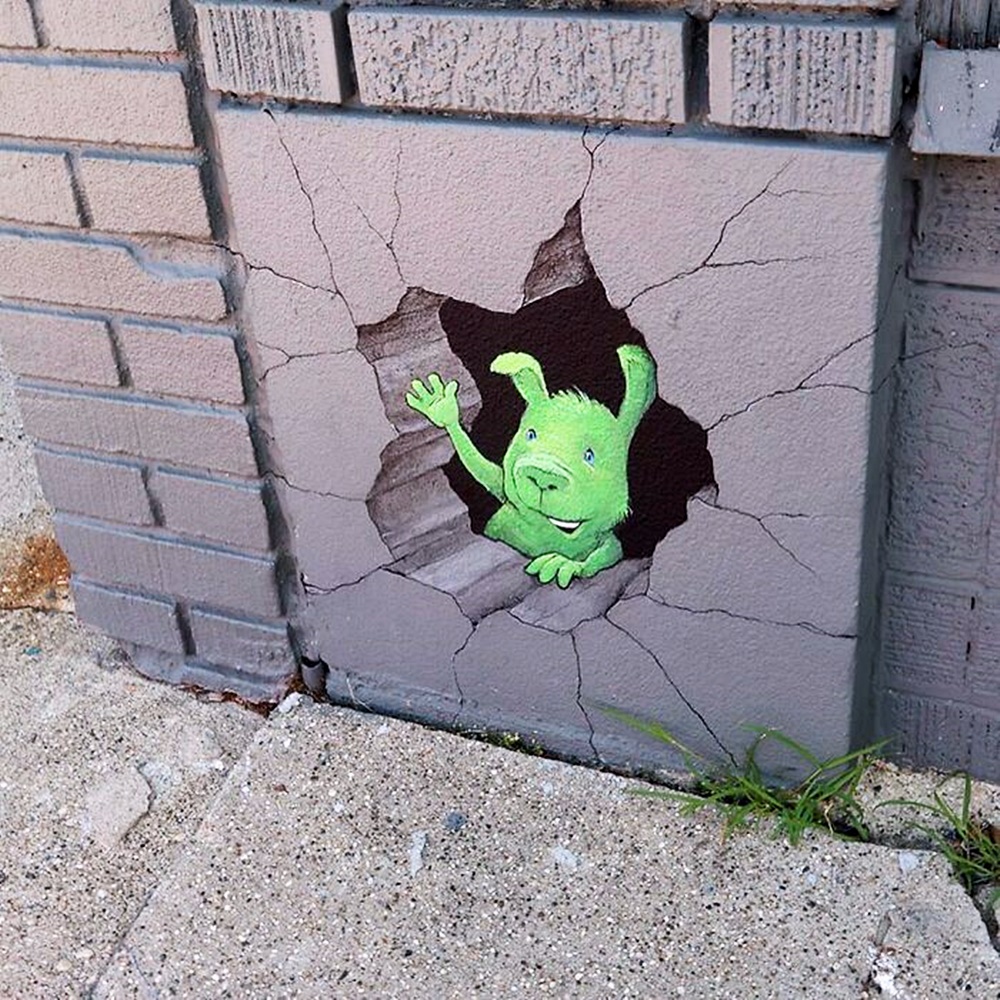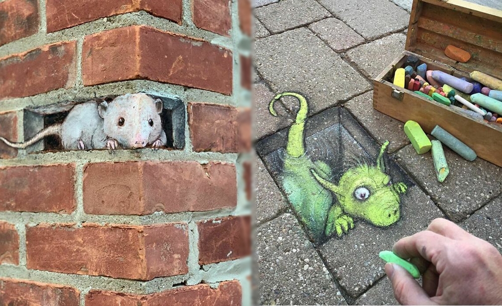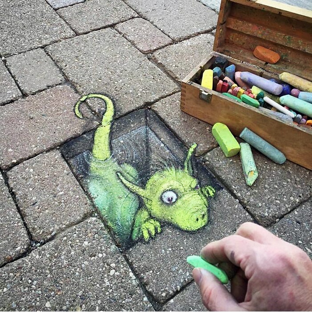 미국 미시간 주의 앤아버에서 활동하고 있는 아티스트 데이비드 진(David Zinn)은 '사라지는 예술'로 유명합니다. 그는 길거리에 분필과 차콜(목탄)만으로 그림을 그리고 있는데요. 이에 시간이 지나거나 비가 오면 그의 그림은 사라져 버리기에 '사라지는 예술'이라는 별칭이 붙었습니다. 그는 길거리를 다니다 얼룩진 콘크리트, 금이 간 벽, 구멍, 작은 틈 등을 놓치지 않고 그림의 소재로 삼고 있습니다. 그리고 귀여운 몬스터들을 매치해 귀여운 그림을 그리고 있습니다.