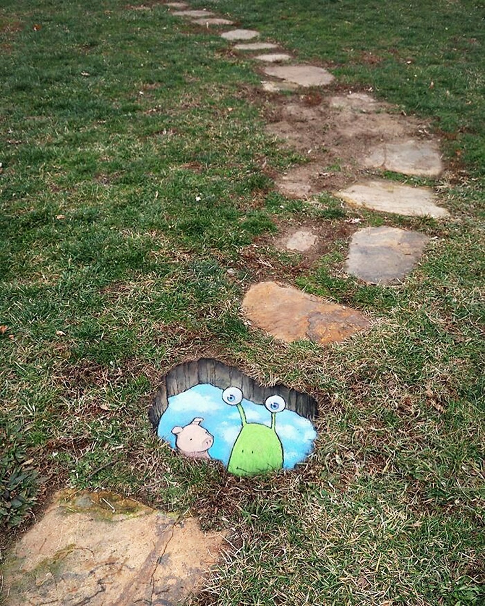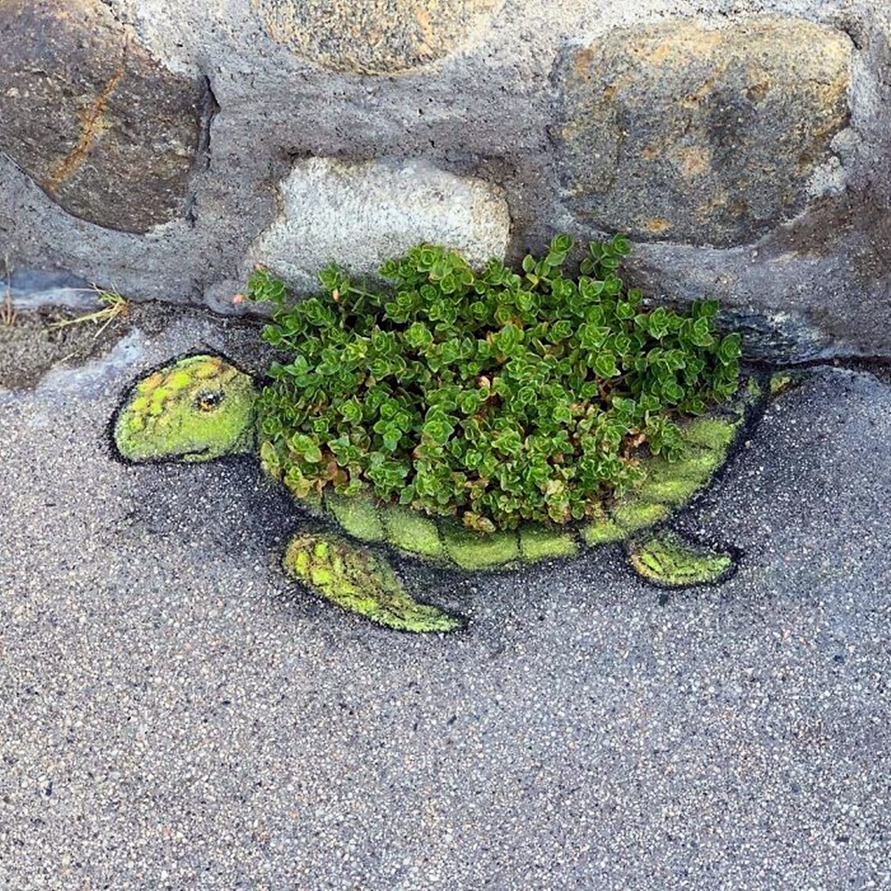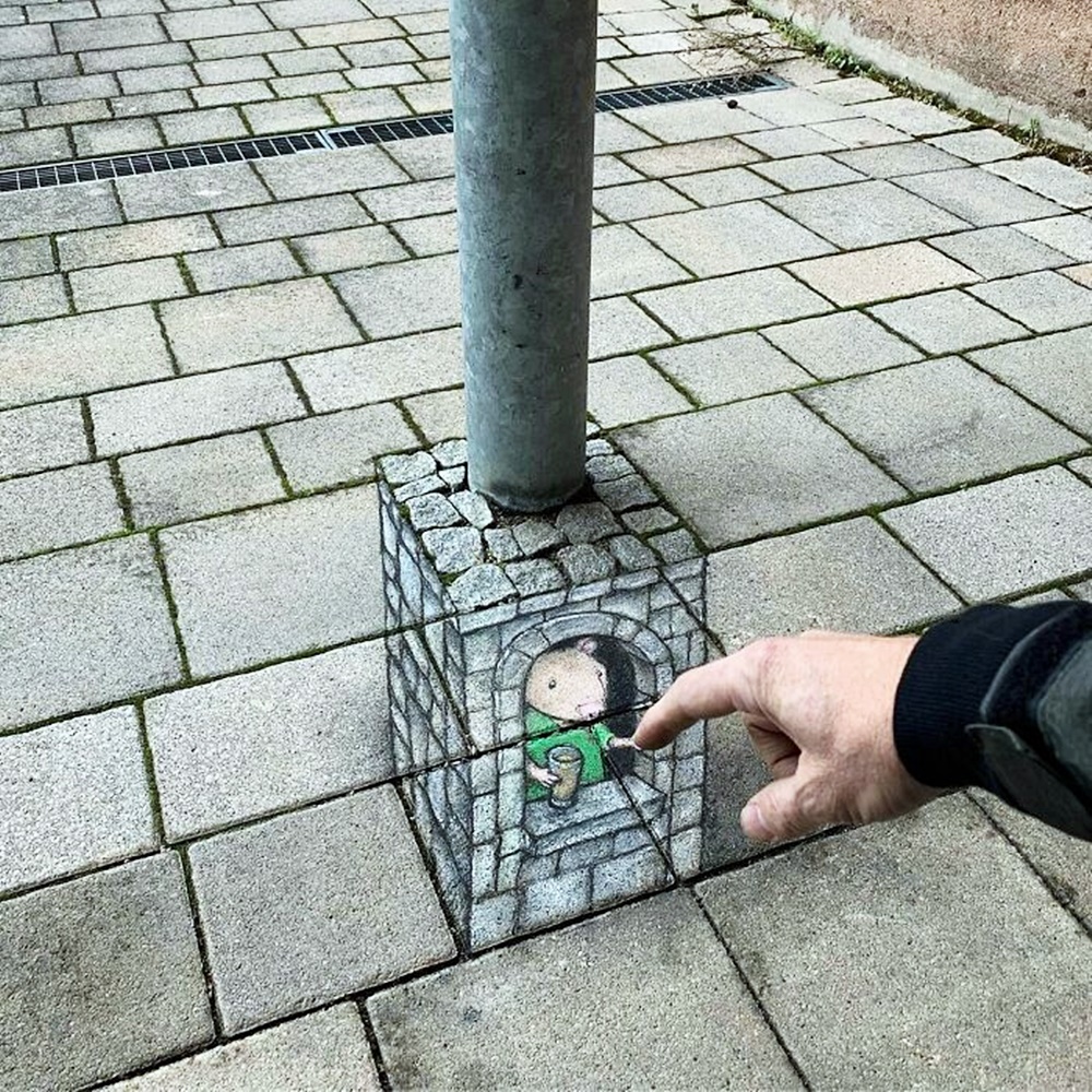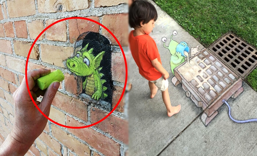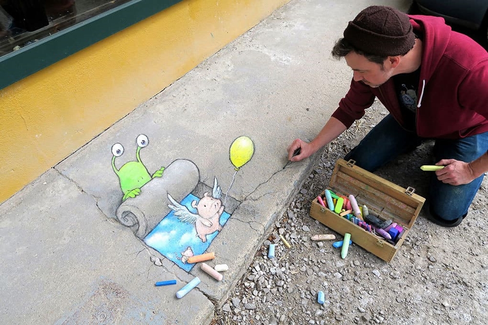 미국 미시간 주의 앤아버에서 활동하고 있는 아티스트 데이비드 진(David Zinn)은 '사라지는 예술'로 유명합니다. 그는 길거리에 분필과 차콜(목탄)만으로 그림을 그리고 있는데요. 이에 시간이 지나거나 비가 오면 그의 그림은 사라져 버리기에 '사라지는 예술'이라는 별칭이 붙었습니다. 그는 길거리를 다니다 얼룩진 콘크리트, 금이 간 벽, 구멍, 작은 틈 등을 놓치지 않고 그림의 소재로 삼고 있습니다. 그리고 귀여운 몬스터들을 매치해 귀여운 그림을 그리고 있습니다.