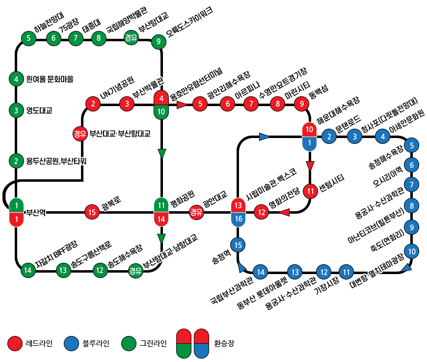 레드라인은 부산역을 출발해 UN기념공원-부산박물관(무정차)-용호만유람선터미널-광안리해수욕장-아르피나(무정차)-수영만요트경기장(무정차)-마린시티-동백섬-해운대해수욕장-센텀시티-영화의전당(무정차)-시립미술관/벡스코-광안대교(무정차)-평화공원-부산항대교(경유)-광복로를 경유해 다시 부산역으로 돌아오는 노선이며, 그린라인 또한 부산역에서 출발해 용두산공원/부산타워(무정차)-영도대교-흰여울문화마을-하늘전망대-75광장(무정차)-태종대-국립해양박물관(무정차)-부산항대교(경유)-오륙도스카이워크-용호만유람선터미널-평화공원-부산항대교(경유)-송도해수욕장-송도구름산책로-자갈치를 경유해 부산역으로 돌아오는 노선입니다.