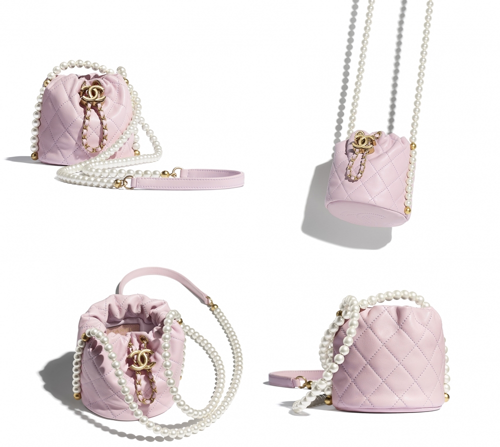 첫 번째로 소개할 가방은 버킷백 디자인으로 출시된 미니드로스트링 백입니다. 이 가방은 어깨에 크로스 방식으로 맬 수 있어 귀엽고 캐주얼한 느낌을 자아내고 있습니다. 가방의 앞쪽에는 볼륨감 있는 골드톤의 메탈 로고가 있고, 샤넬 특유의 퀼팅 디자인으로 누가 봐도 샤넬 가방임을 알 수 있습니다. 흰색 이미테이션 진주는 럭셔리함을 극대화하고 있으며, 가방의 바닥에도 샤넬 로고가 수놓아져 있는 것이 특징이네요. 이 가방은 카프스킨 소재로 되어 있으며 라이트 핑크 컬러로 샤넬 공식 홈페이지에 따르면 403만 원에 판매되고 있습니다.