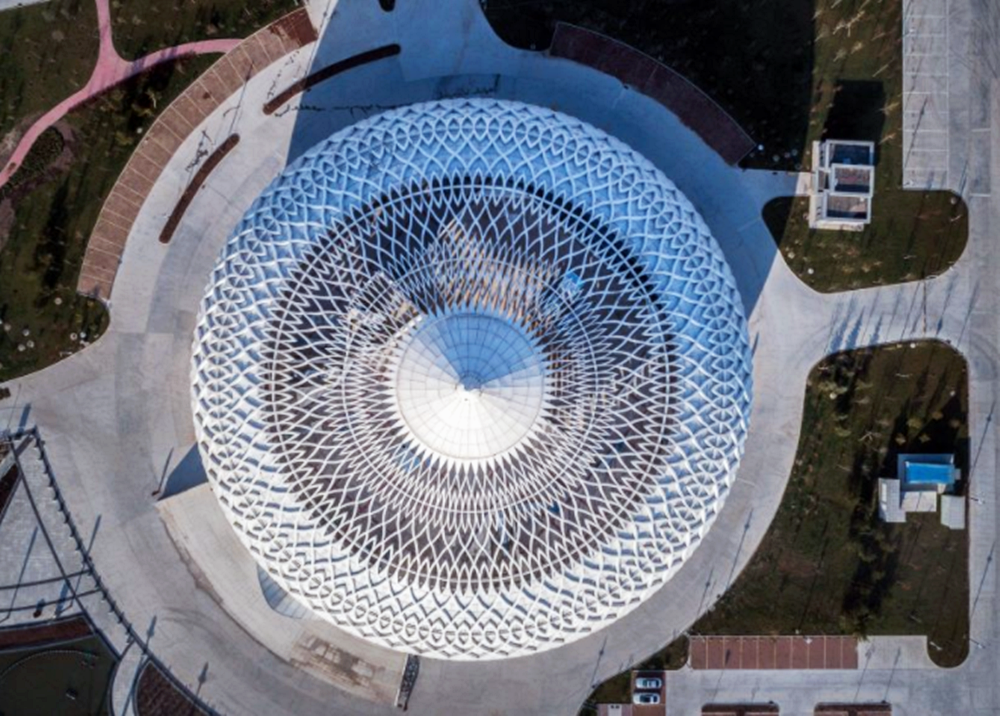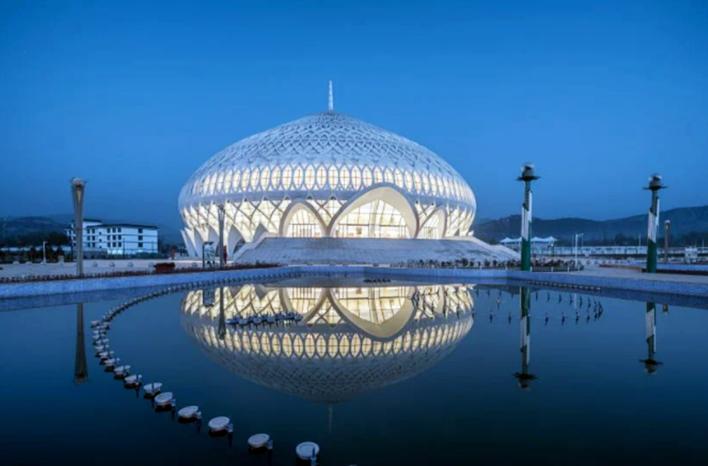 린샤국립대극장은 2010년 중국 상하이에서 설립된 건축 스튜디오 'DUTS 디자인'에서 설계한 것인데요. 극장을 딱 보면 첫눈에 뭔가 중동 스타일의 디자인인 것을 눈치챌 수 있습니다. 마치 모스크의 돔 같은 이 건축물은 실제로 오만에 있는 오만 그랜드 모스크에서 영감을 받아 만든 것인데요. 린샤 당국에서 구체적으로 오만 그랜드 모스크를 닮은 건축물을 만들어달라고 DUTS 디자인 측에 요청했고, 이들은 그랜드 모스크를 어떻게 하면 재해석할 수 있을지 고심한 끝에 이 건축물을 설계하게 되었습니다.