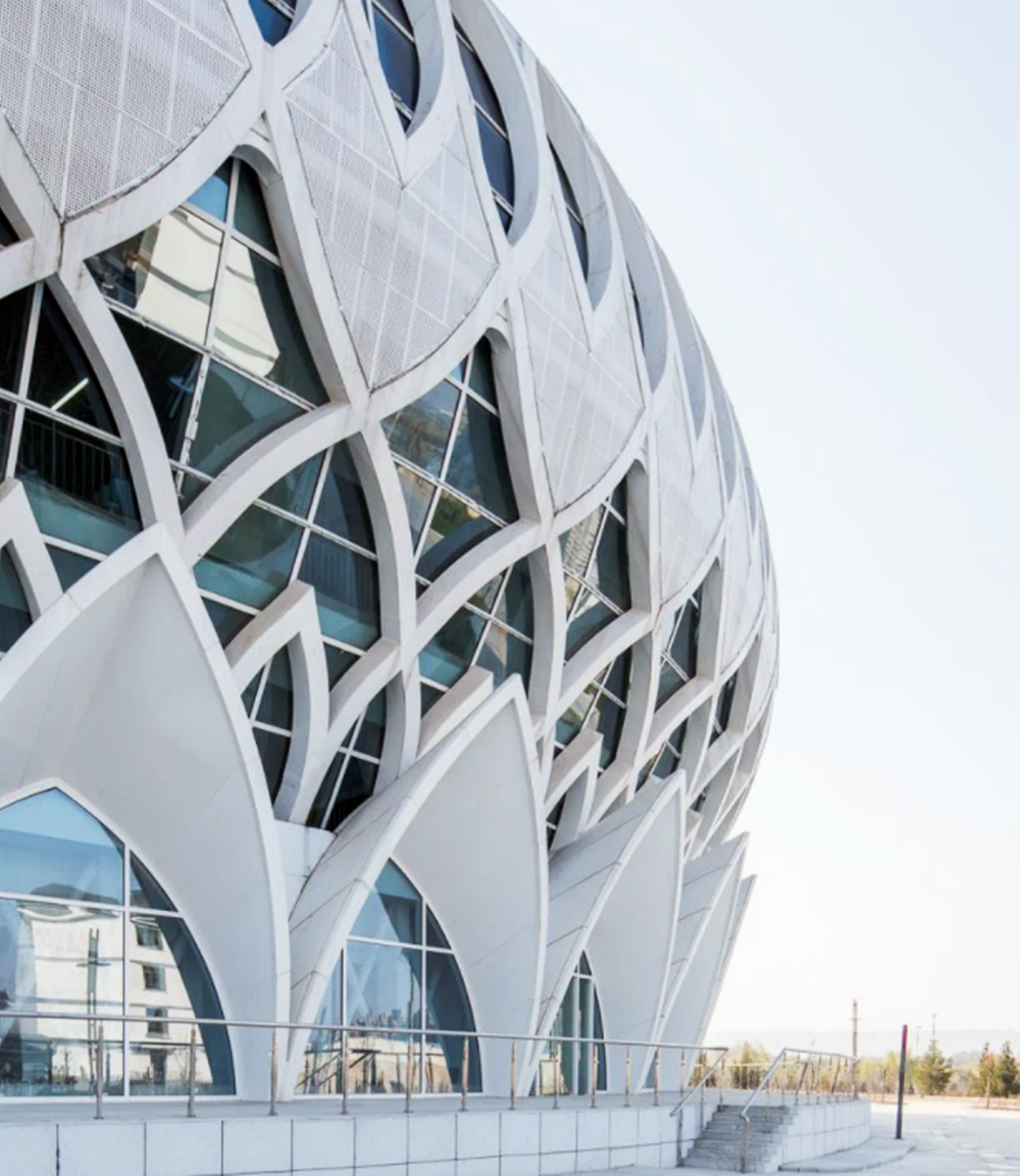 이들은 모스크 돔의 패턴을 만들어내기 위해 '알루미늄 커튼 월'을 포기했습니다. 대신 중국 베이징에 있는 국립올림픽스포츠센터의 새 둥지와 비슷한 돔의 질감과 유사하도록 강철 빔을 엇갈리게 용접하는 방식을 택했습니다. 또한 건물의 구조가 매끄럽게 이어지고, 비용을 절감하기 위해 쉘 구조, 커튼월 구조, 커튼월 텍스쳐를 하나로 합쳤죠.