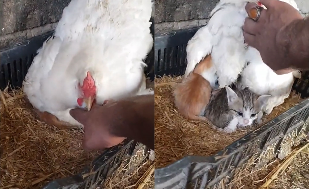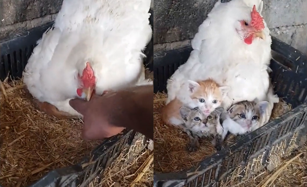 한편 닭은 날씨가 춥거나 위험한 상황에서 병아리를 자신의 품 안에 품는다고 하는데요. 춥거나 비가 올 때 병아리들에게 날개 아래는 따뜻한 안식처가 되고 솔개나 다른 동물들의 공격을 피할 때도 어미의 날개 아래로 숨기곤 하죠. 그리고 이 암탉은 자신만의 방식으로 아기 고양이들을 돌보고 있었던 것입니다.