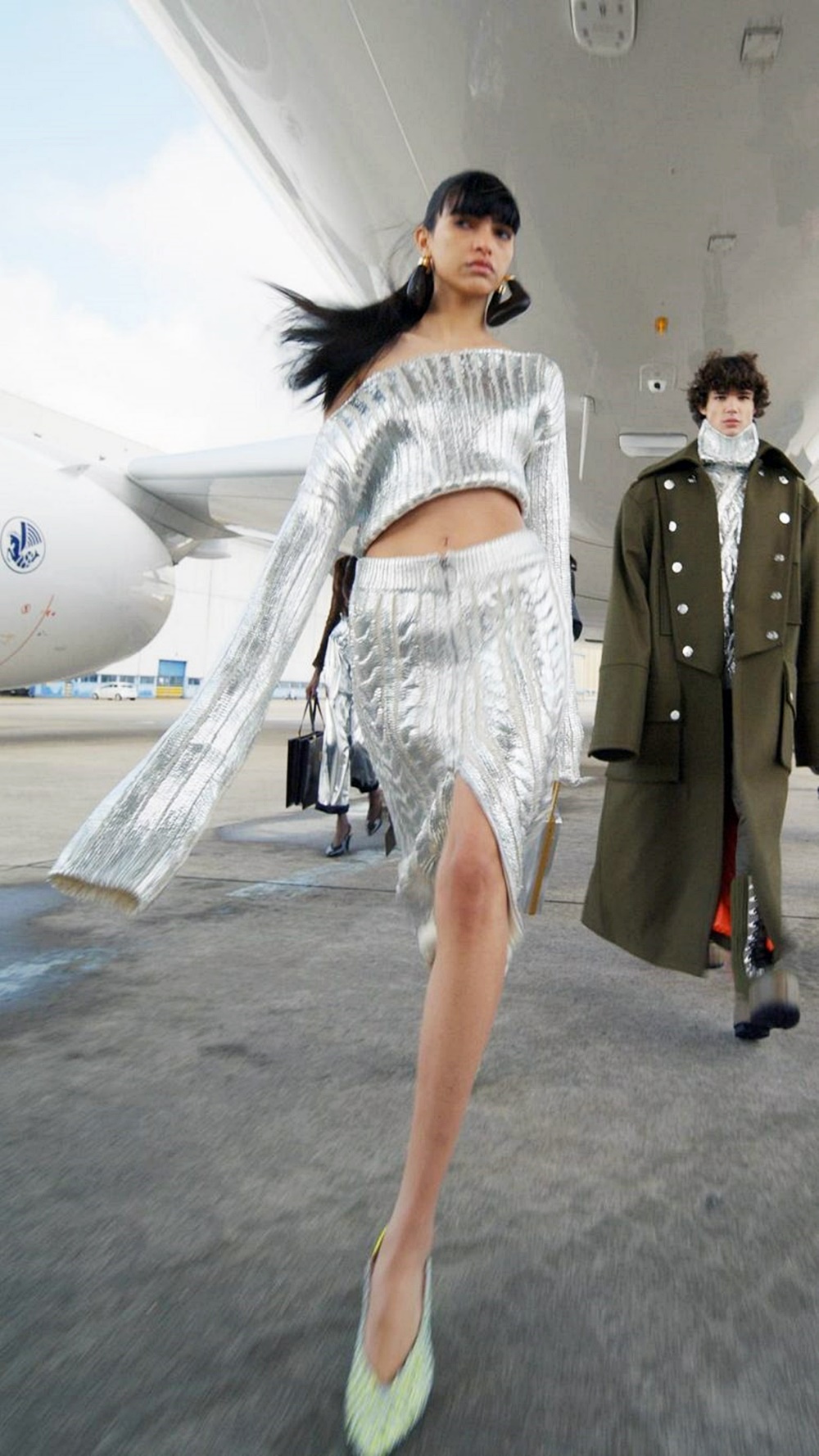 모델들은 다양한 장소에서 2021 가을 컬렉션을 입고 등장했는데요. 처음에는 비행기의 비상구로 나와 비행기의 날개 위로 저벅저벅 걸어왔으며, 이후에는 비행기가 서 있는 램프에 그어진 노란 선을 따라 캣워크를 이어가기도 했습니다. 이뿐만이 아니었습니다. 비행기 동체 아래 바퀴 사이로 걷는가 하면, 비행기의 격납고로 보이는 곳을 런웨이로 만들기도 했죠. 마지막으로는 달 모양의 오브제 앞에서 마치 우주에 떠있는 듯한 런웨이를 선보이기도 했습니다.