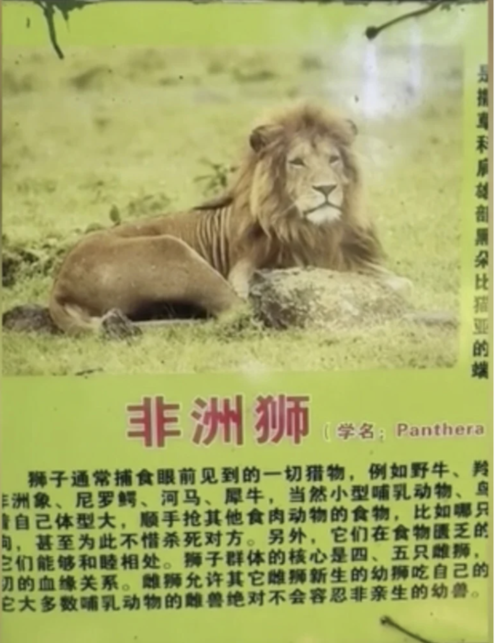 영상 속에는 아프리카 사자에 대한 설명이 적힌 표지판이 나와있었는데요. 정작 이 표지판이 적혀있는 우리에는 골든 레트리버 한 마리가 들어 있었습니다. 아프리카 사자와 골든 리트리버 사이의 공통점이라고는 색상밖에 없는 것 같네요.