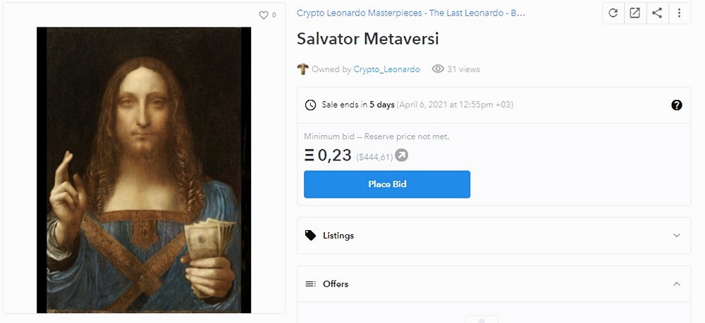 현재 이 작품은 0.23이더리움, 약 482달러 상당의 입찰가가 매겨져 있는데요. 4월 6일까지 경매가 진행될 예정입니다. 과연 '살바토르 메타버시'에는 얼마의 가격이 매겨질까요? 많은 네티즌들의 관심이 모아지고 있습니다.